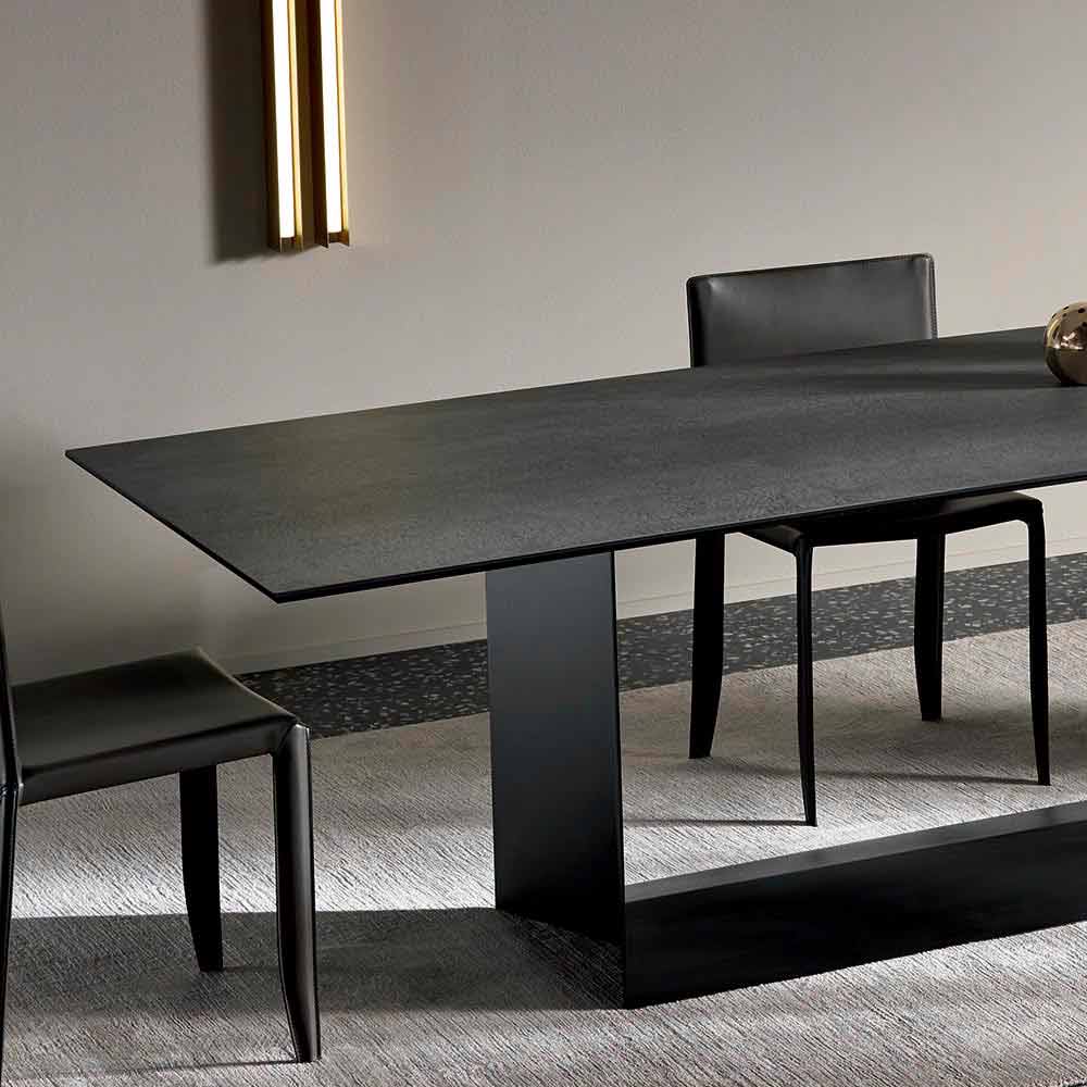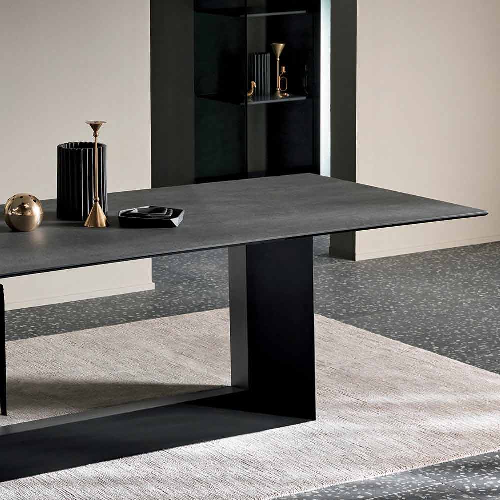 Luxusní stůl z matné antracitové kamenné keramiky Savoy a černého grafitového kovu, vyrobený v Itálii.