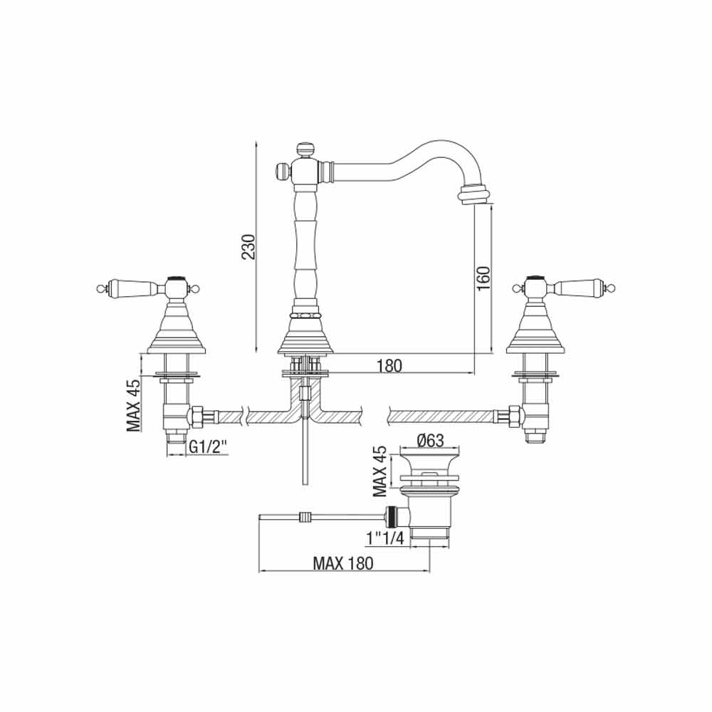Klasická mosazná 3otvorová umyvadlová baterie vyrobená v Itálii.