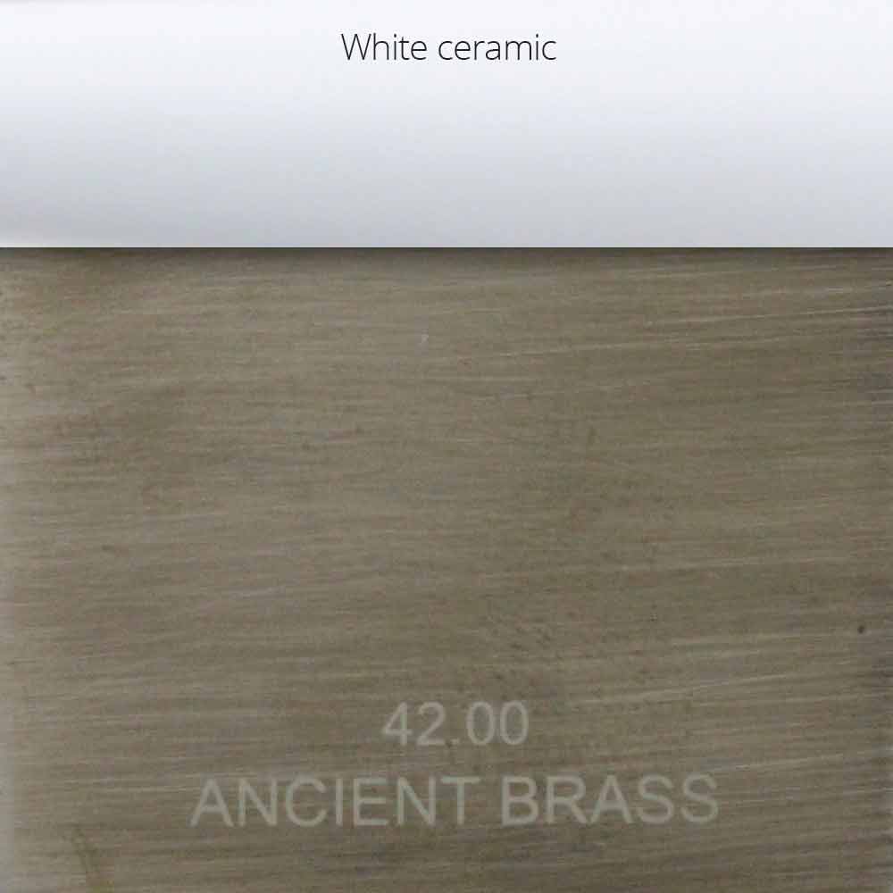 - Lesklá starodávná mosaz: leštěná starožitná mosazná povrchová úprava s bílými keramickými vložkami na rukojetích;
