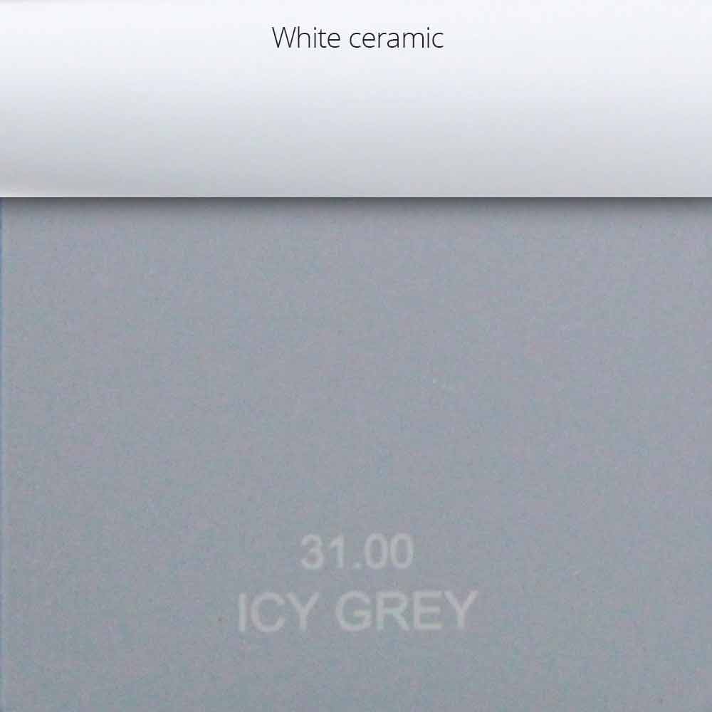- Icy Gray: matná studená světle šedá povrchová úprava s bílými keramickými vložkami na rukojetích;