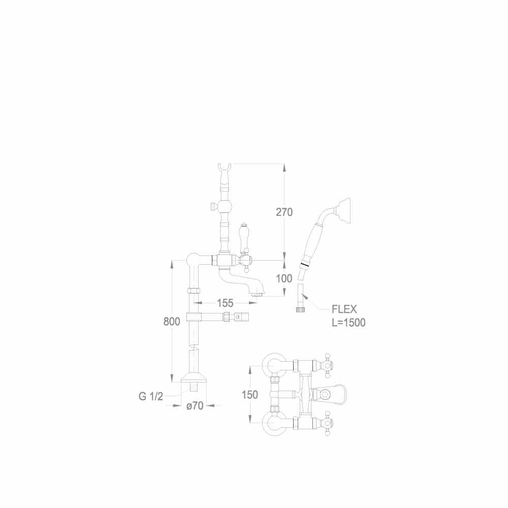 Exponovaná vanová baterie na podlahových sloupech s přepínačem a ruční sprchou duplex Made in Italy.