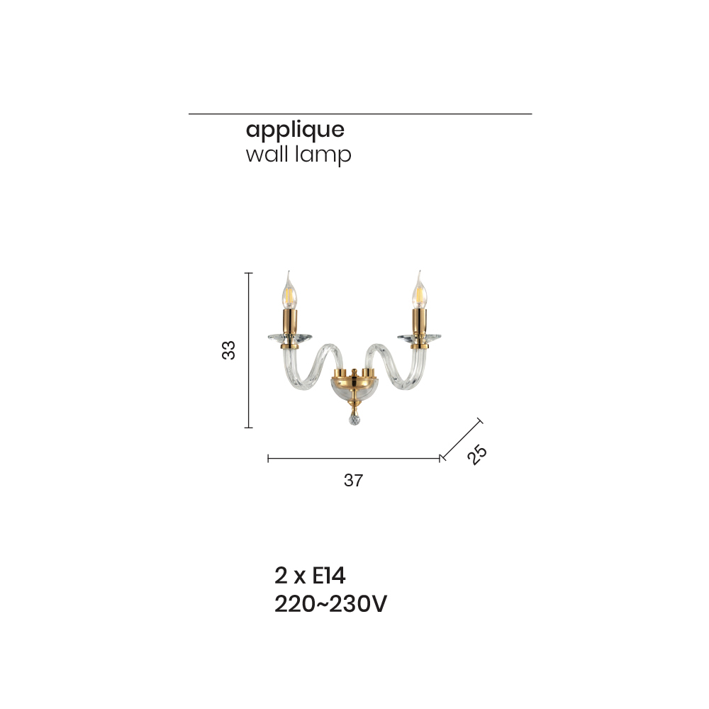 Vyrobeno ze 2 obloukových ramen z ručně opracovaného skla s kovovými detaily , podšálky z broušeného křišťálu obsahují světelné zdroje a struktura je ozdobena kulatým přívěskem z optického krystalu .