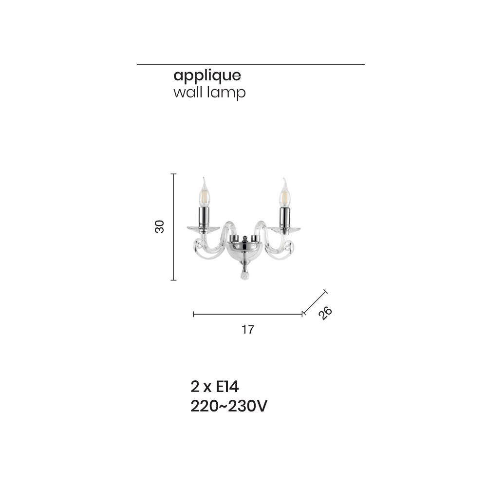 Vyrobeno z ručně opracovaného skla a optického krystalu s vysoce kvalitními materiály a zvláštním důrazem na detail , nástěnné svítidlo se stane protagonistou prostředí, ve kterém bude umístěno, zdobené kulatým přívěskem z optického krystalu a detaily v chromu. kov .
