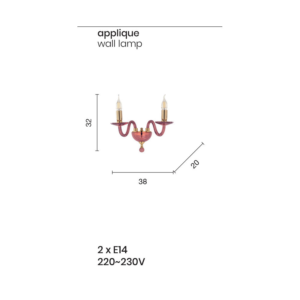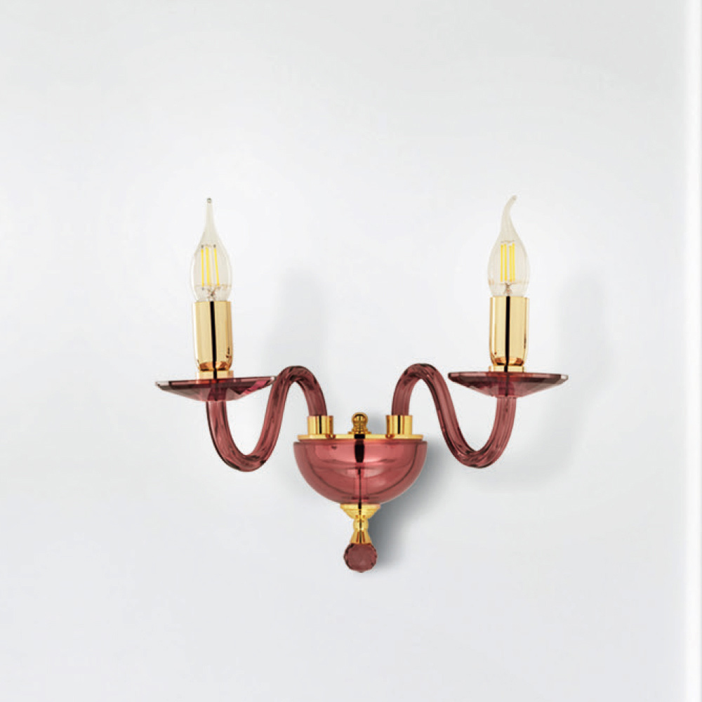 Toto nástěnné svítidlo klasického stylu se skládá ze 2 obloukových ramen vyrobených ze skla ručně vyráběného v Itálii ve vínové úpravě které podporují talíře se zdroji světla.