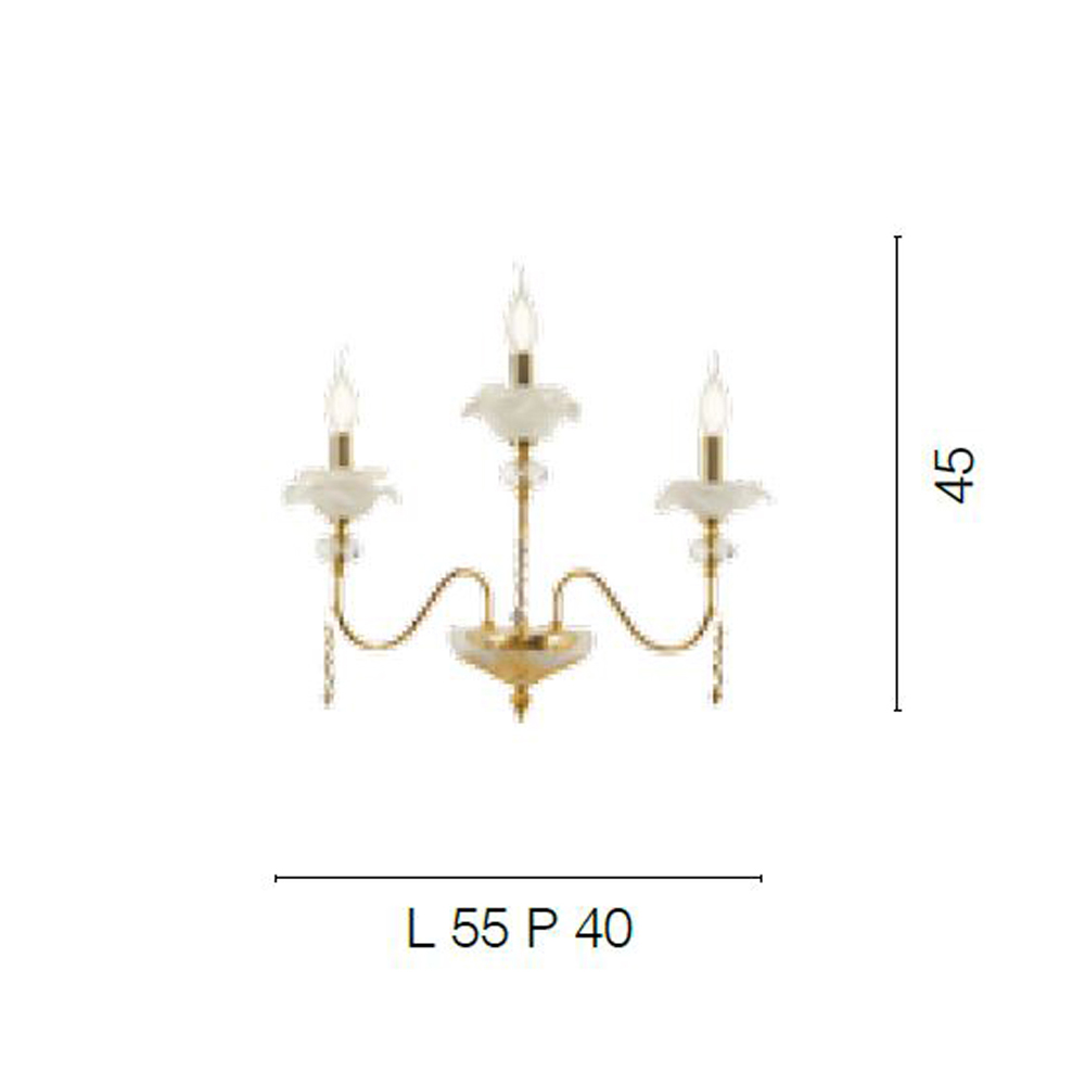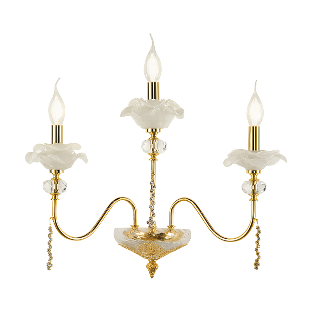 Nástěnná lampa se 3 světly z ručně vyráběného skla s poupaty a křišťálovými kapkami, luxusní vyrobeno v Itálii.