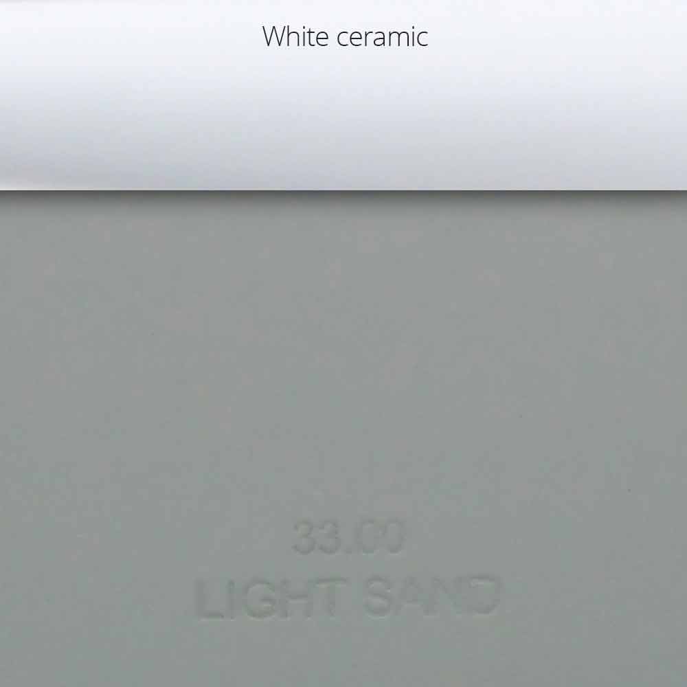 - Light Sand: neprůhledná teplá světle šedá povrchová úprava s bílými keramickými vložkami na rukojeti;