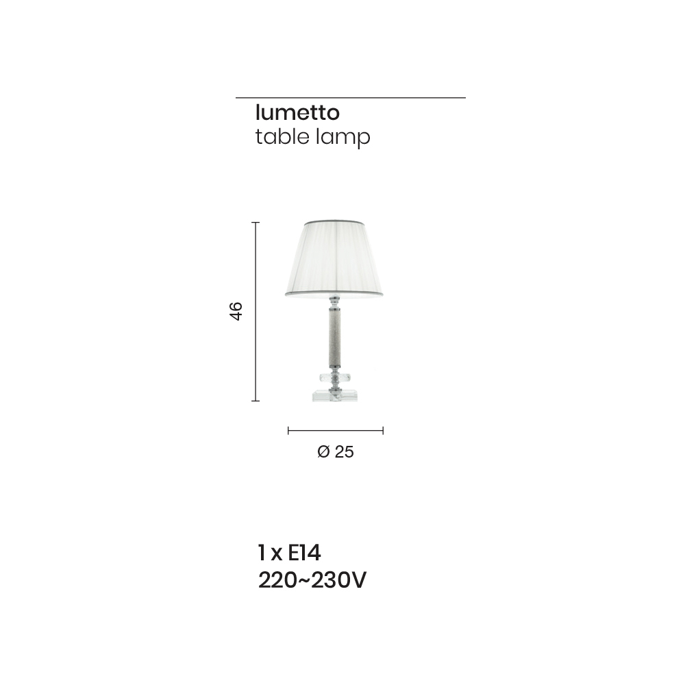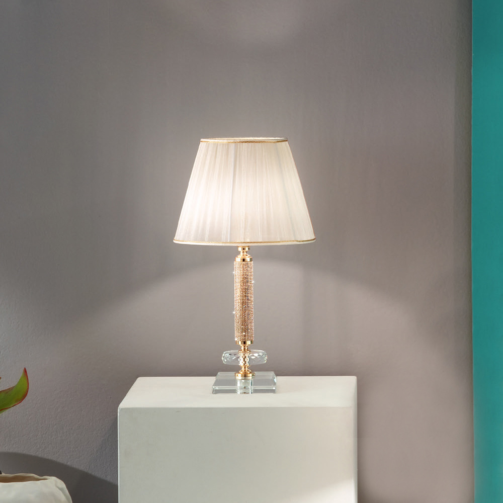 Design uzavírá stínidlo z plisované efektní látky , která zajišťuje měkké a tlumené osvětlení; ideální jak na noční stolky do ložnice, tak na pracovní stůl v kanceláři nebo obývacím pokoji v klasickém a elegantním stylu.