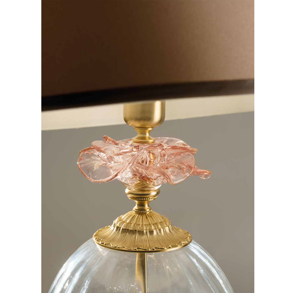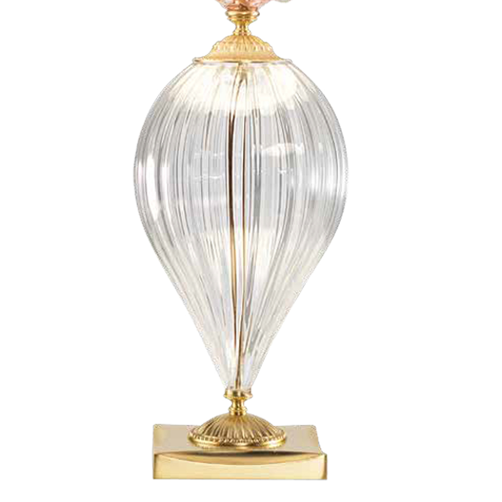 - Tělo z průhledného skla - detaily z růžového skla - saténově zlatý kov a růžové stínidlo;