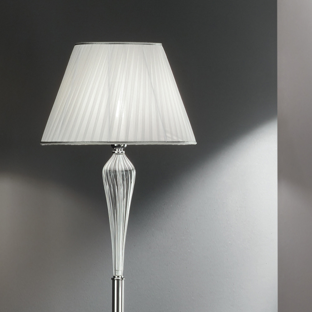 Zvláštní charakteristiku dodávají vzácné motivy vyráběné ze skla ručně vyráběné v Itálii s "rigaton" efektem, který odhaluje kovové jádro a podpírá stínidlo z bílé plisované efektní látky .