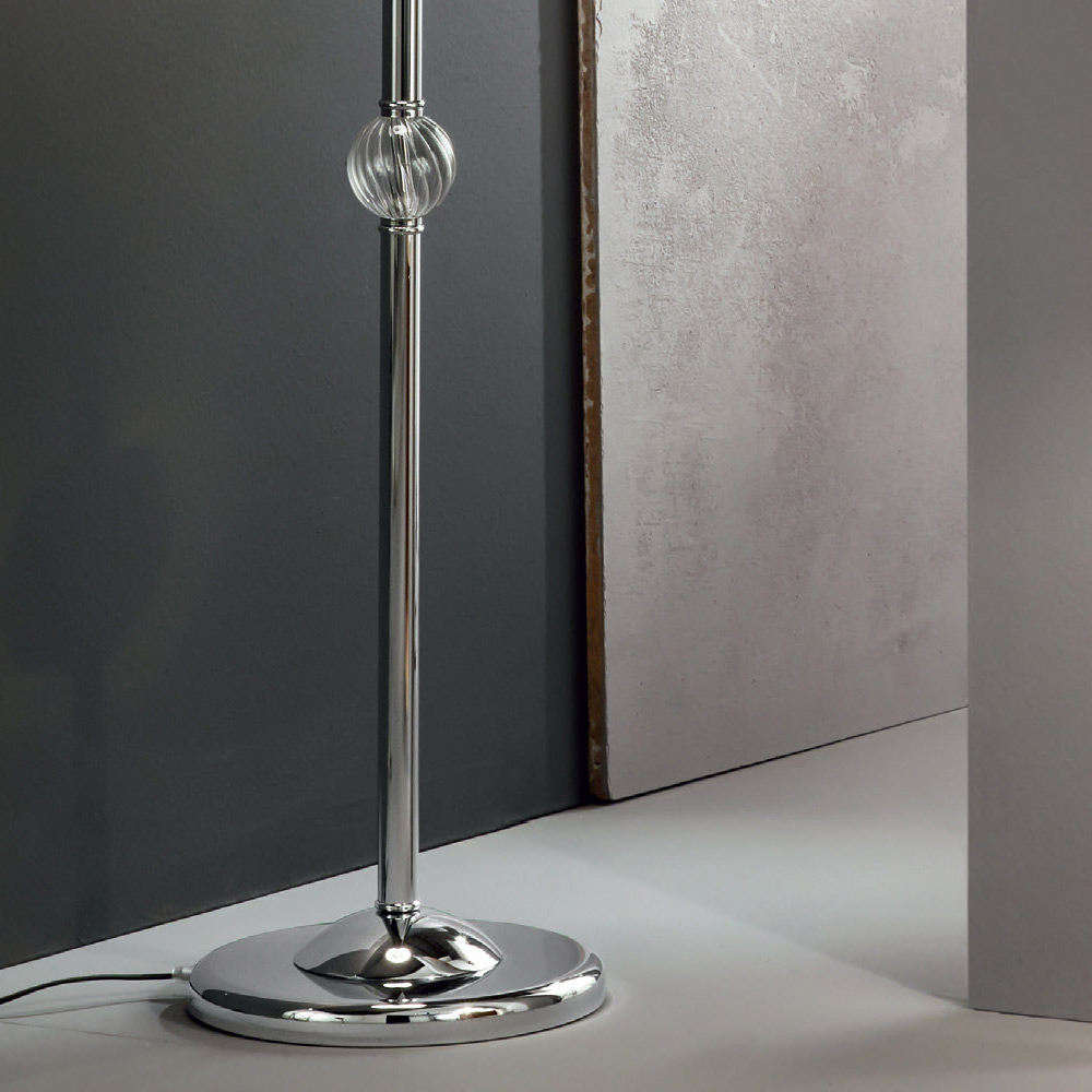 Tato stojací lampa klasického stylu má kulatou základnu a část konstrukce je vyrobena z chromovaného kovu.