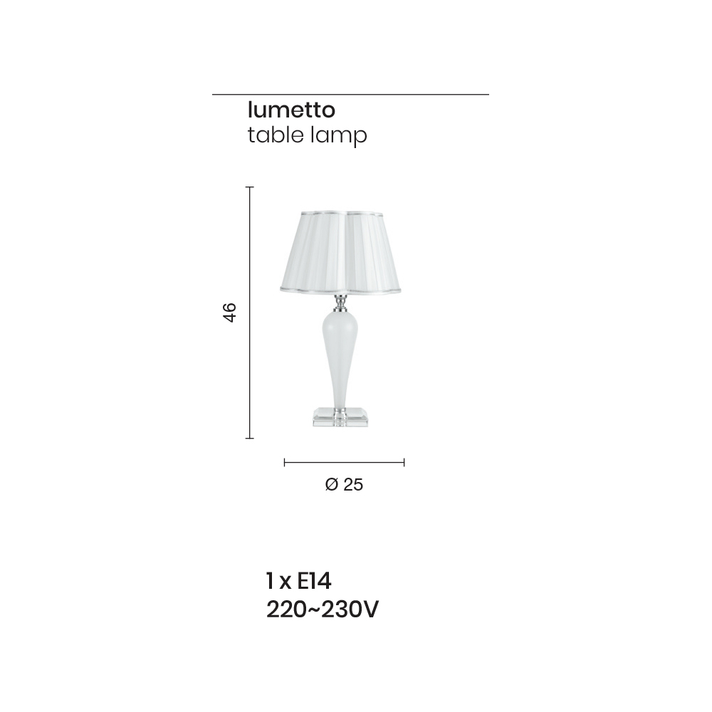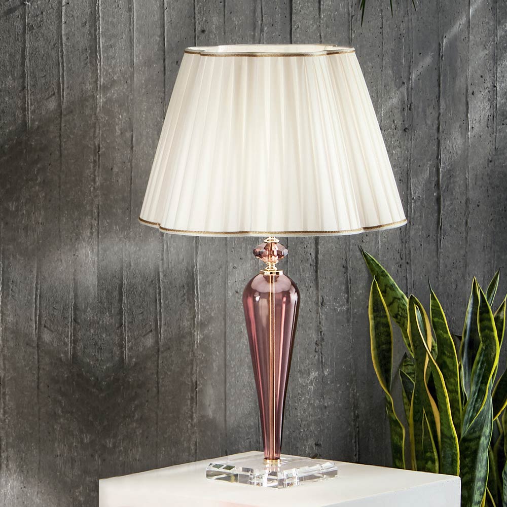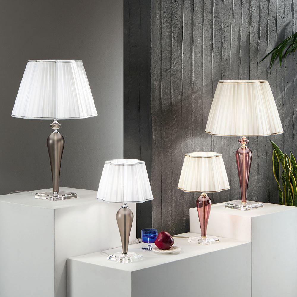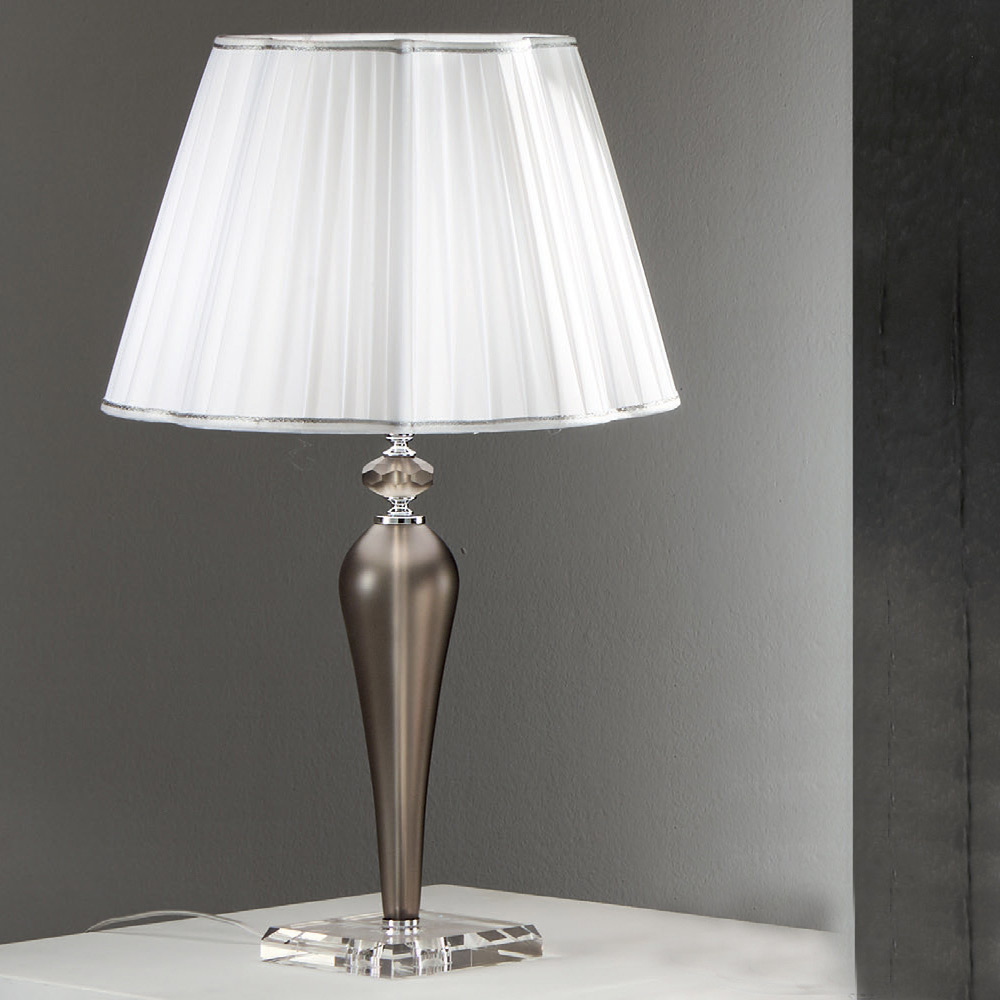 Kovová stolní lampa, ručně vyráběné sklo a stínidlo vyrobené v Itálii.