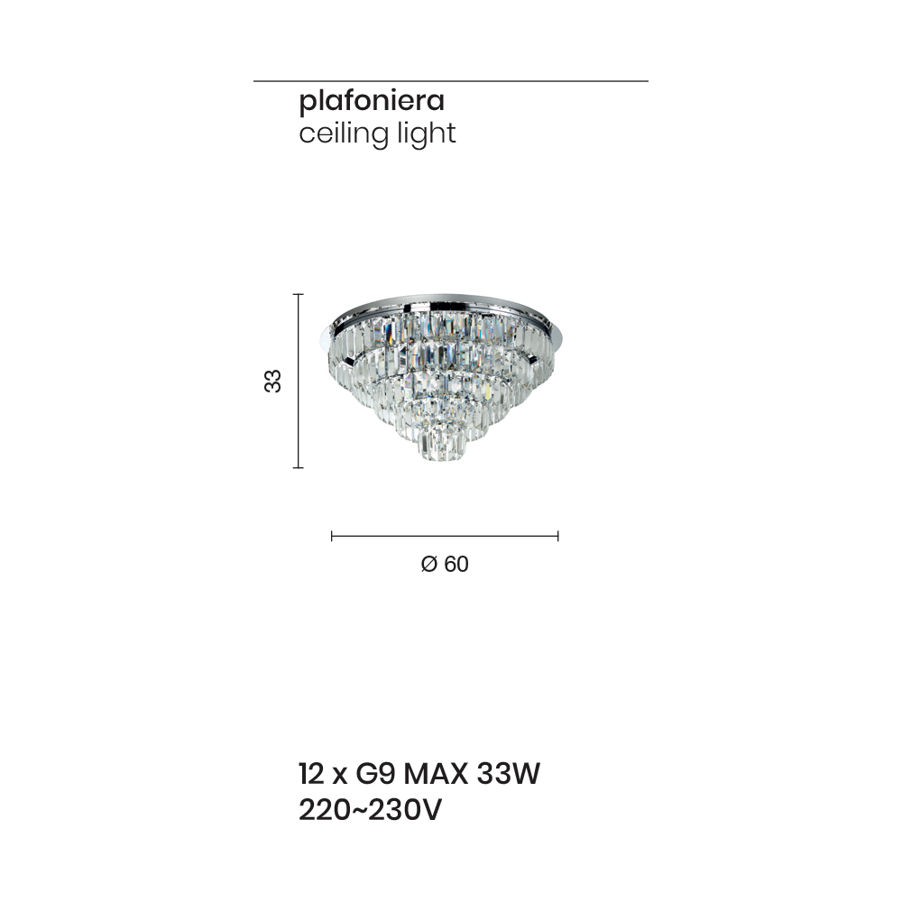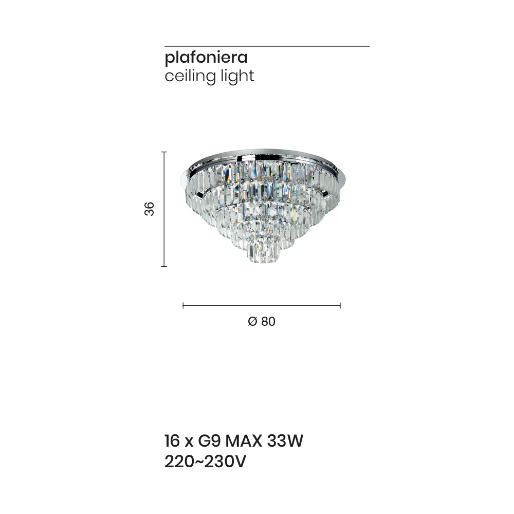 Skládá se ze stříbrné kovové konstrukce a křišťálových přívěsků , které zdobí a osvětlují jakékoli prostředí vkusem a charakterem, ve směsi stylu, třídy a inovace.