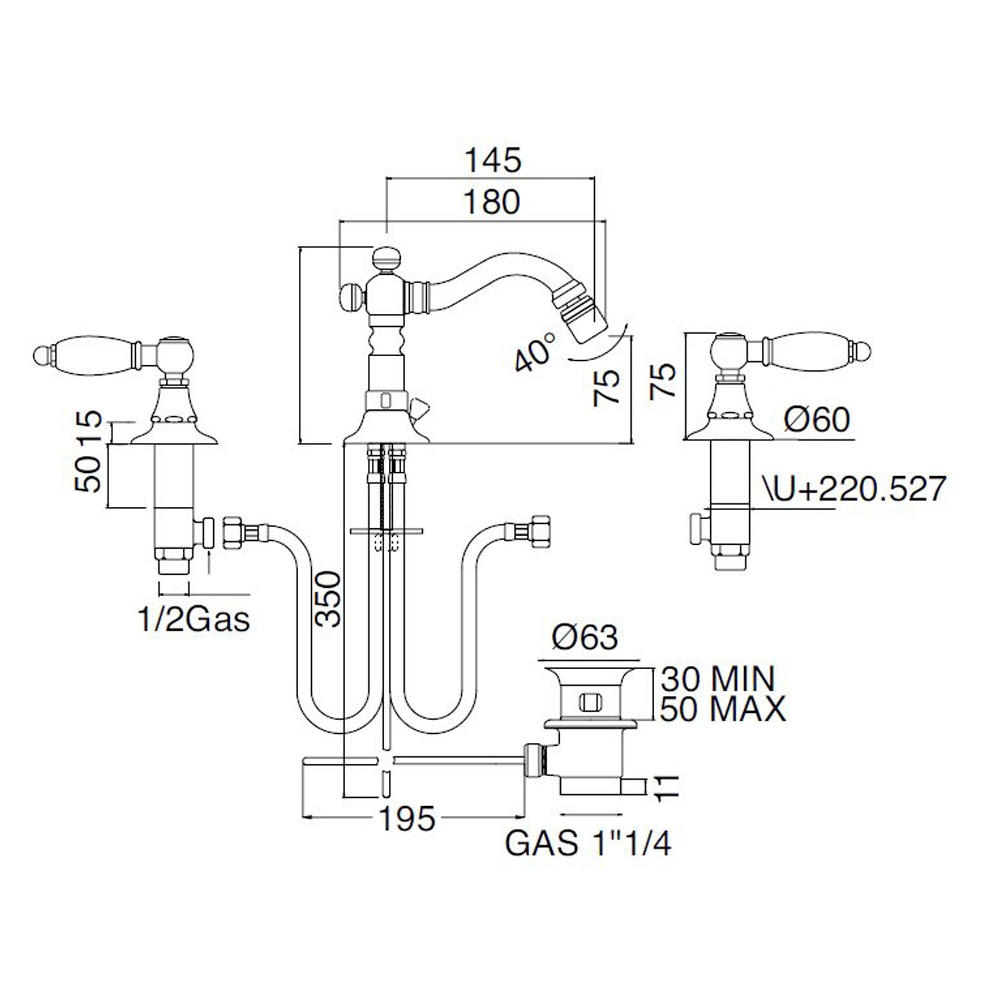 Tříotvorová baterie Bidet s pákami klasický mosazný styl, kvalitní řemeslné zpracování vyrobené v Itálii.