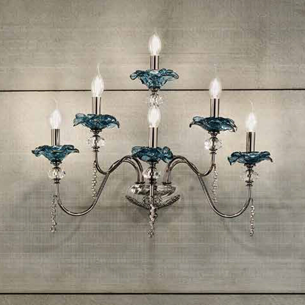 Nástěnná lampa se 6 světly z ručně vyráběného skla s poupaty a křišťálovými kapkami, luxusní vyrobeno v Itálii.