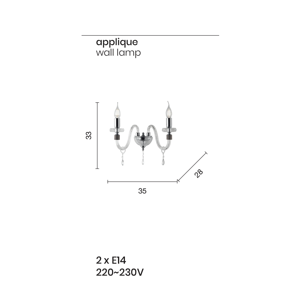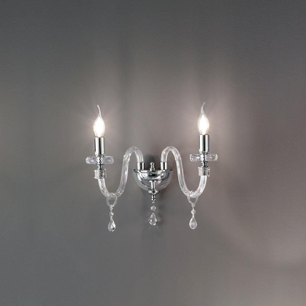 Toto nástěnné svítidlo klasického stylu se skládá ze 2 obloukových ramen vyrobených z průhledného skla ručně vyráběného v Itálii s "rigaton" efektem, jejichž konce jsou obklopeny třpytkami zasazenými do kovu, stejně jako pro střední část doplňku, kde jsou dvě trubky kruhové disky podpírají strukturu proloženou dvěma kruhovými disky různých velikostí z broušeného křišťálu.