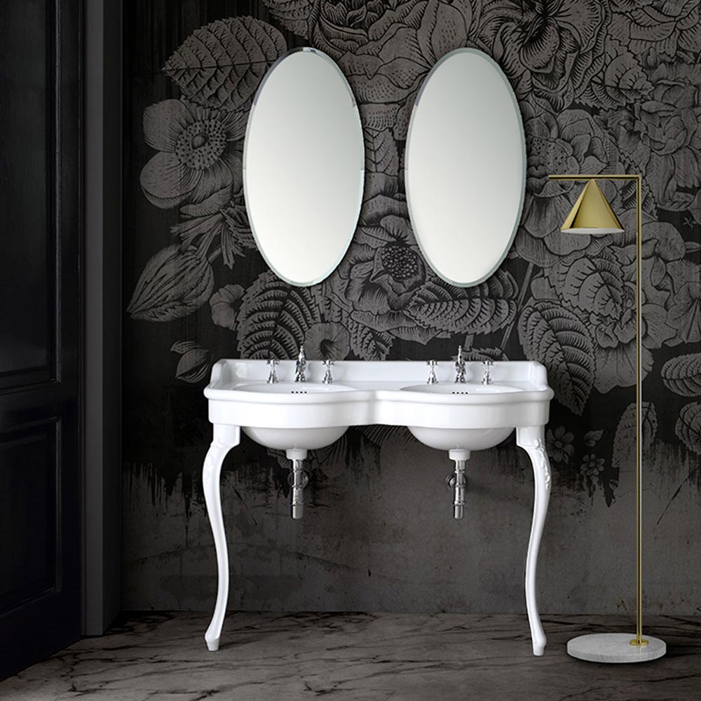 Umyvadlo pro konzolu s dvojitým umyvadlem ručně vyrobeno z bílé keramiky prostřednictvím výroby 100% Made in Italy . Extrémně elegantní estetika je to, co charakterizuje tento nádherný kus nábytku se starodávnou duší, která připomíná typické styly minulosti. Dvě praktické vany zvyšují a zdůrazňují jeho funkčnost, zatímco rafinovaný tvar nohou zdůrazňuje jeho majestátnost a propracovaný design .