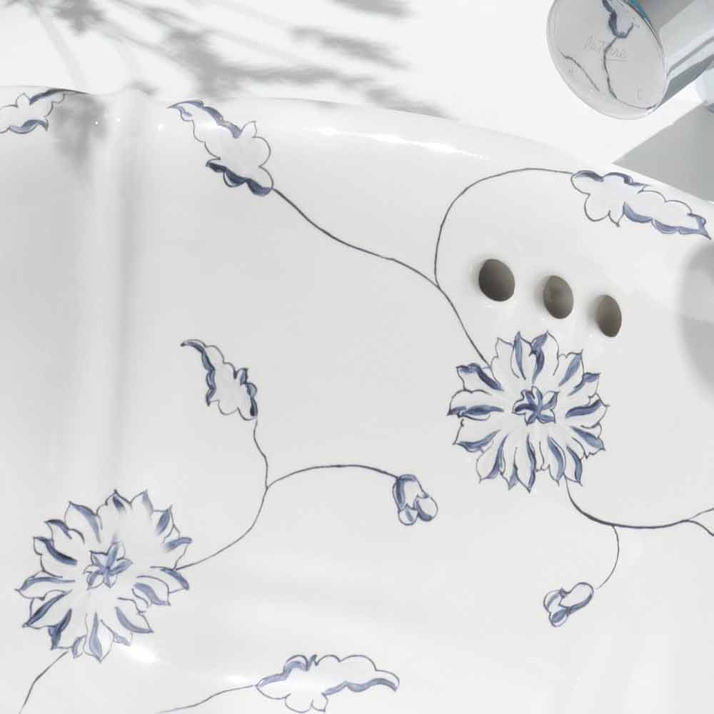Vestavěná umyvadla vyrobená v Itálii v tenkém bílém porcelánu s vnitřní výzdobou modrých květů ručně vyráběných s kartáčkem.