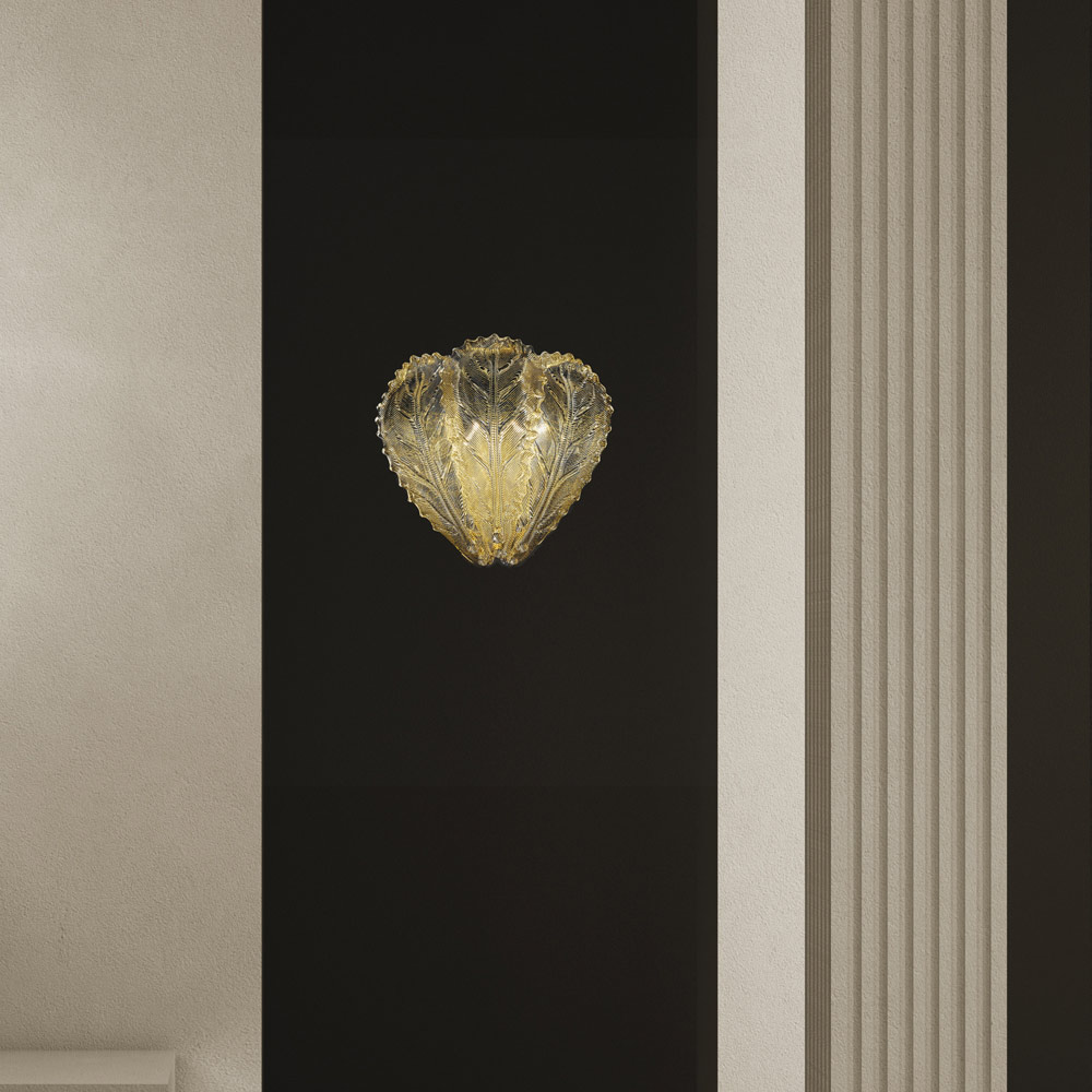 2-světelné nástěnné svítidlo vyrobené z ručně vyráběného benátského skla s povrchovou úpravou ve 24K zlatě s lesklými zlatými kovovými detaily. Z dokonalé kombinace elegantní naturalistické inspirace a silné funkční stránky se zrodilo řešení zařízení, které charakterizuje každé prostředí díky své ikonické přítomnosti , ale zároveň je lehké a živé. Jeho jedinečnost podtrhuje speciální zpracování za tepla, které umožňuje otisknout žilky listů na povrch skla pro exkluzivní a noblesní výsledek . Realismus je podbarven elegantními tóny, které jsou umocněny použitím skleněného posypu tón v tónu a oživují tak skutečné umělecké dílo.