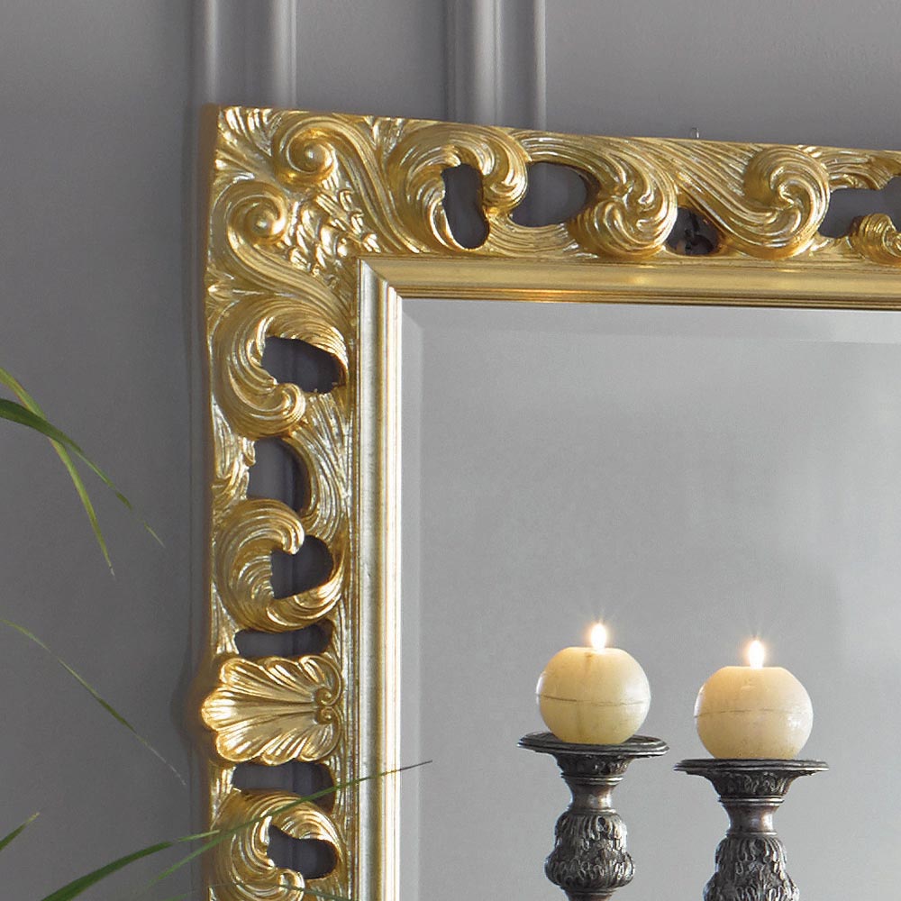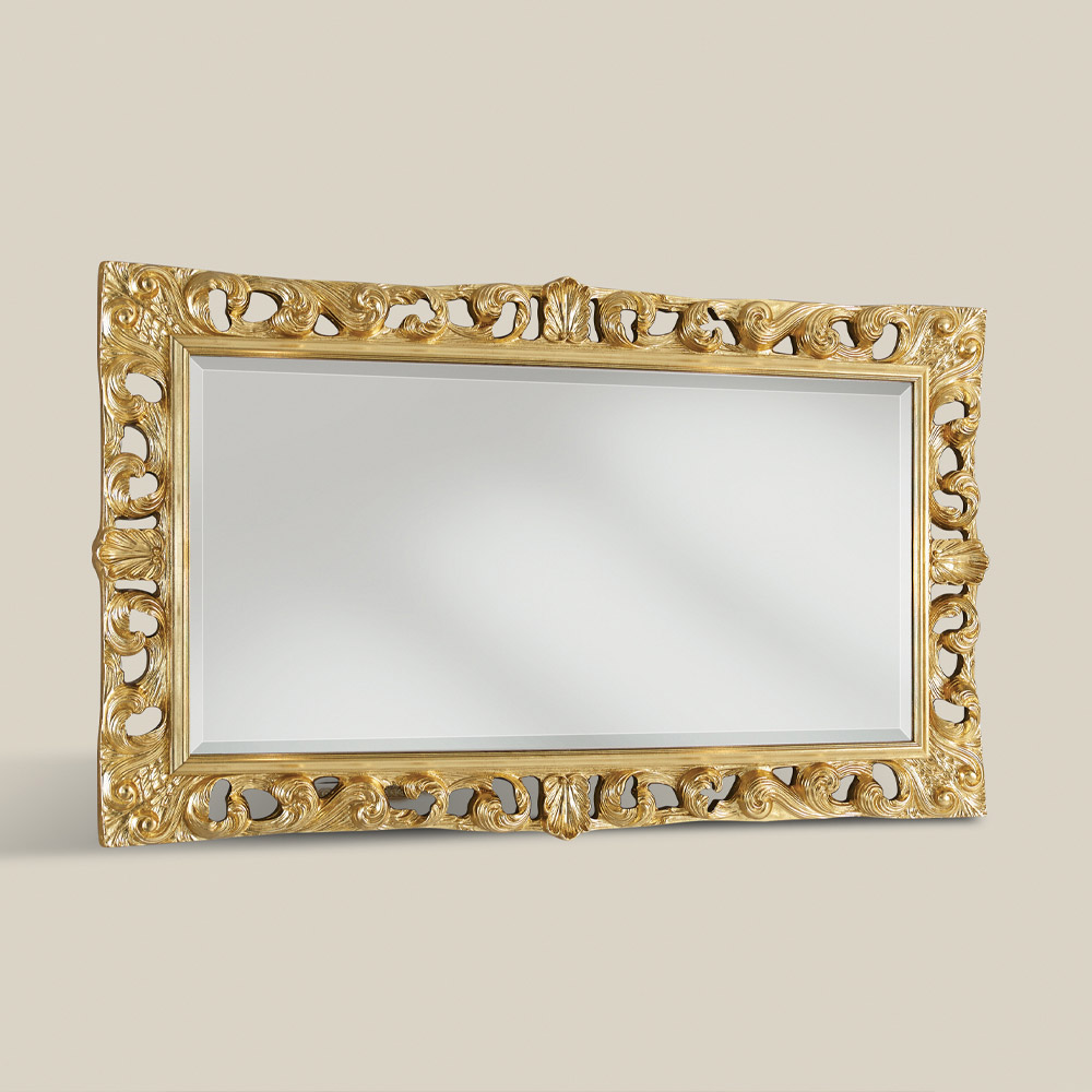 Klasické obdélníkové zrcadlo s dřevěným rámem zdobeným plátkovým zlatem . Díky svým elegantním a harmonickým tvarům je ideální pro dodání klasického a luxusního prostředí každému prostředí.