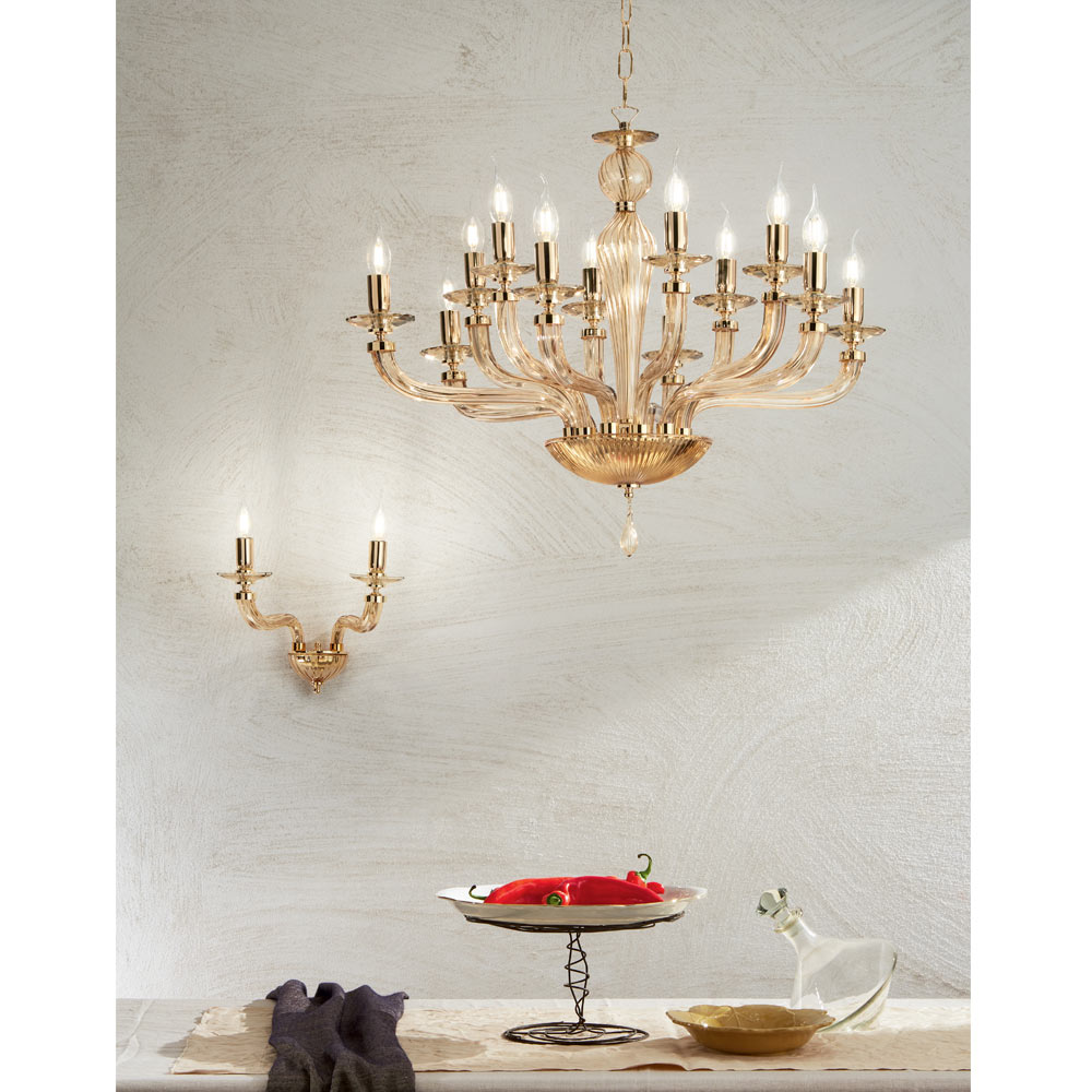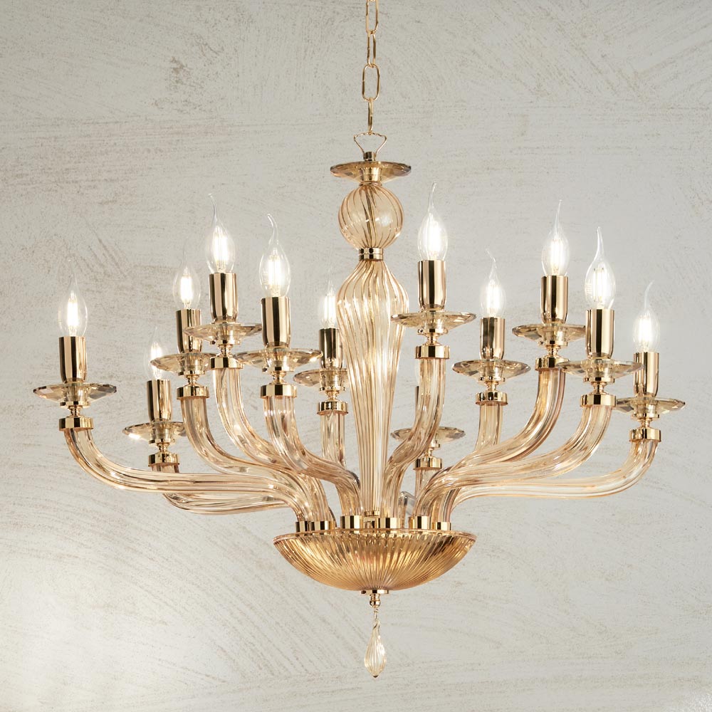 Tento závěsný lustr klasického stylu se skládá z 12 zakřivených ramen vyrobených ze skla ručně vyráběného v Itálii s efektem "rigaton" v jantarové úpravě, která podpírají talířky se zdroji světla.