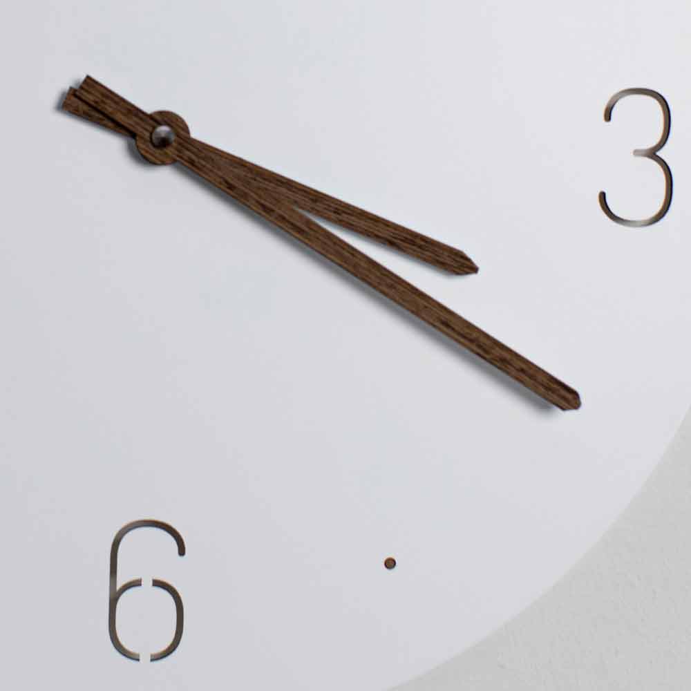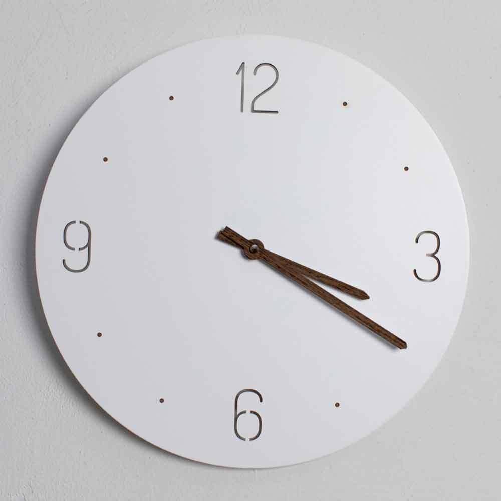 Kulaté a základní designové nástěnné hodiny z bílého lakovaného a laserem řezaného dřeva, vyrobené v Itálii.