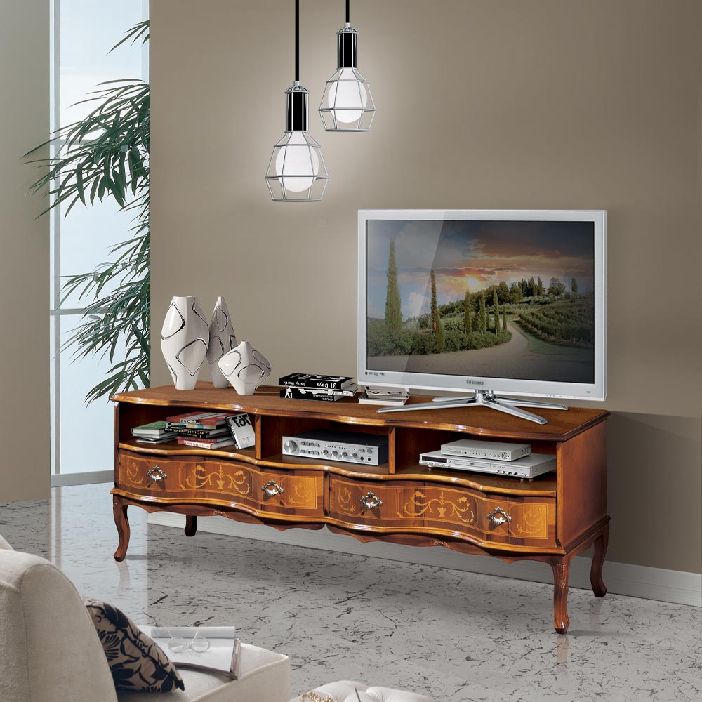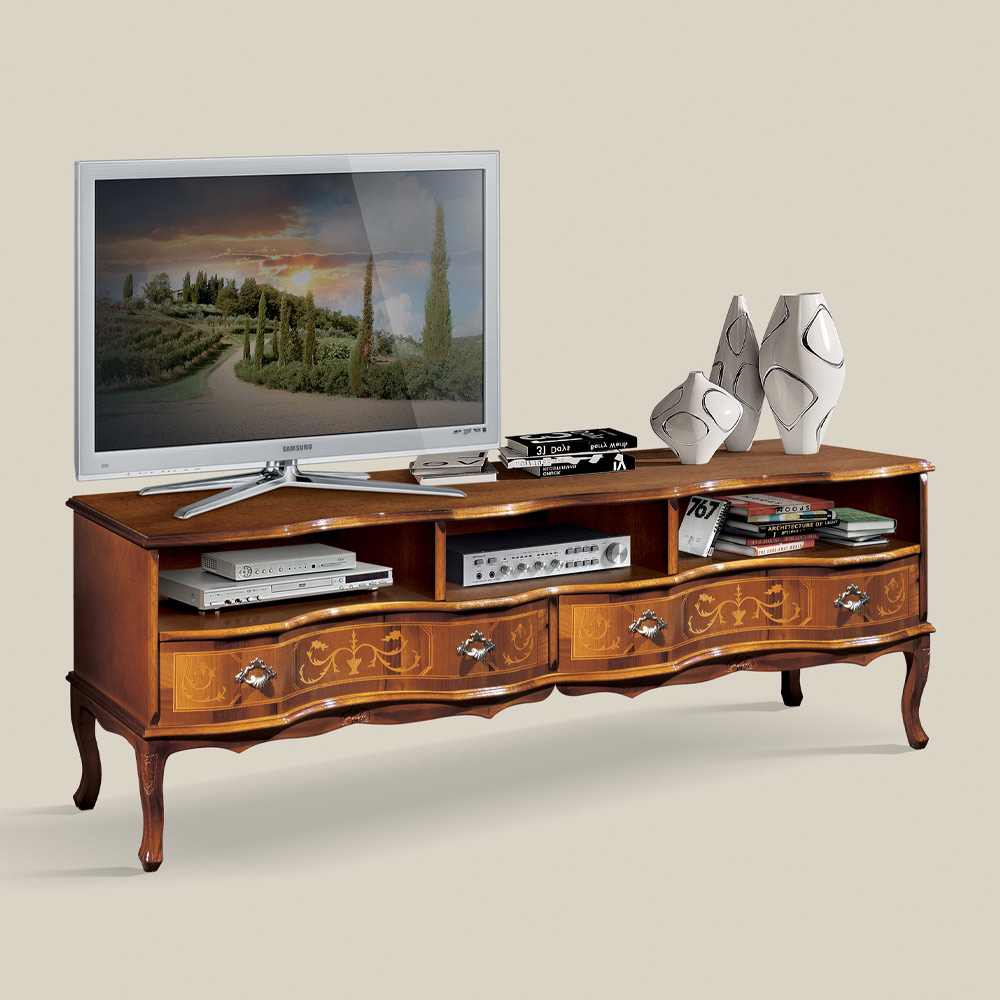Klasický dřevěný TV stolek s přihrádkami a zásuvkami, vyrobený v Itálii.