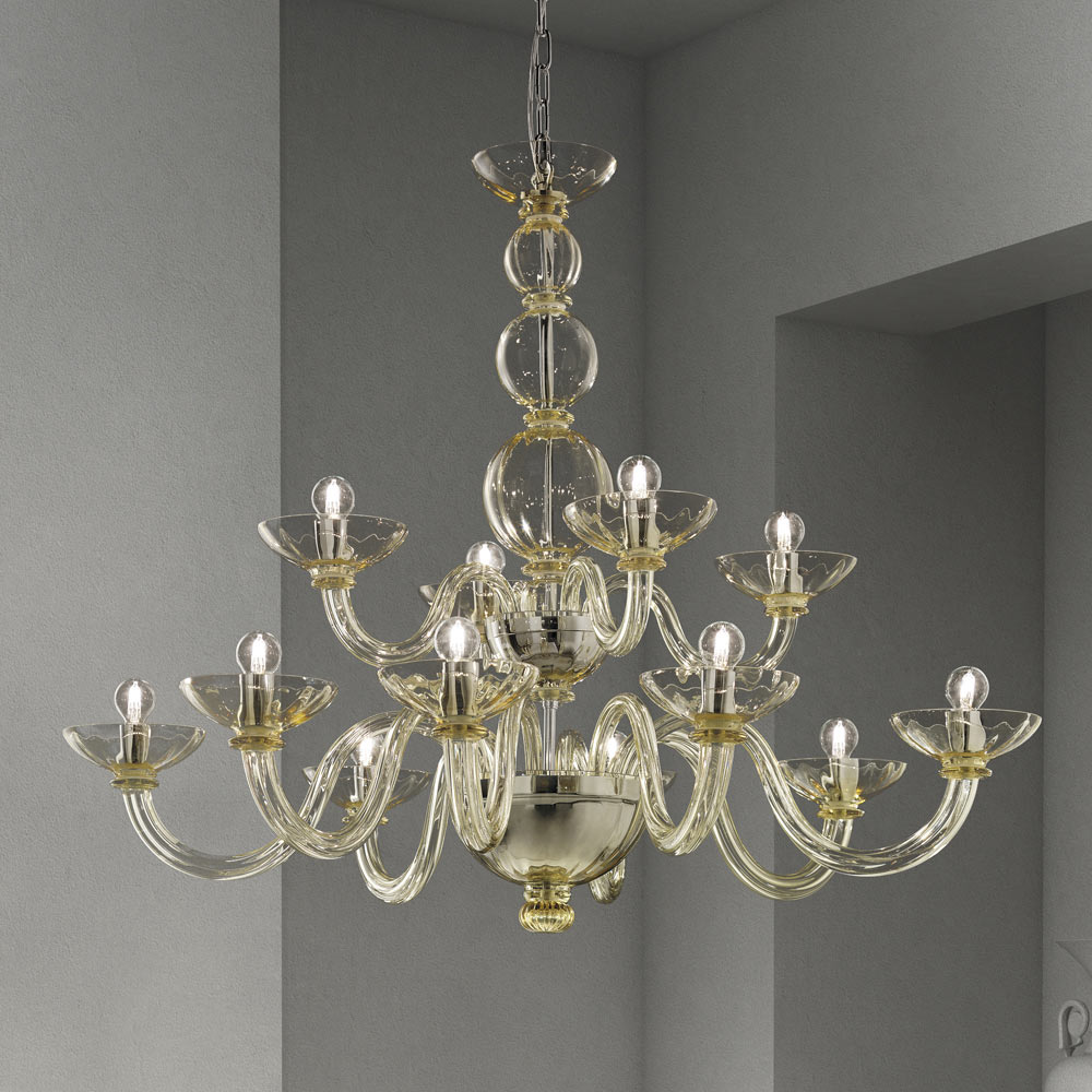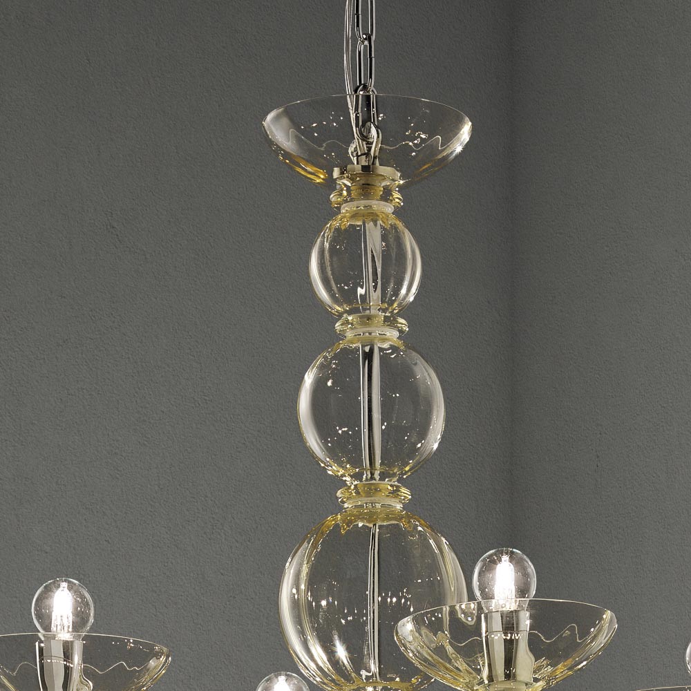 Lustr s 12 světly z benátského skla, ručně opracovaný topaz s detaily z leštěného chromovaného kovu . Kus nábytku s úžasnou a ikonickou přítomností vyznačující se jemnou a jemnou linií a rafinovanými křivkami , které se dokonale přizpůsobí klasickému prostředí, ale zároveň i prostorům se současným stylem. Prvek tradice je prošpikován jeho úžasnými komponenty ve zcela ručně vyráběném foukaném skle, které se díky trendovým barvám mění k modernizaci. Jeho obklopující tvary z něj dělají ideální prvek k obsazení jakéhokoli prostředí, domácího i smluvního, s třídou a dynamikou .