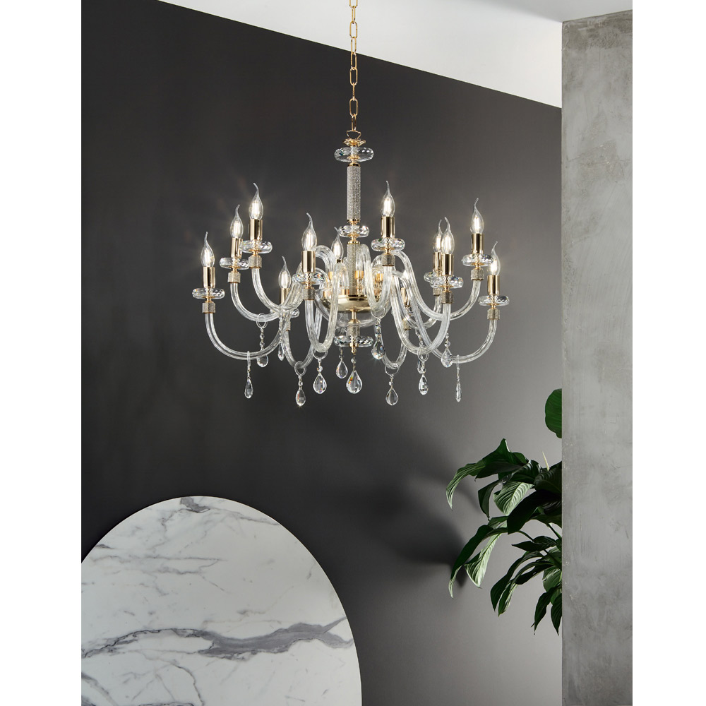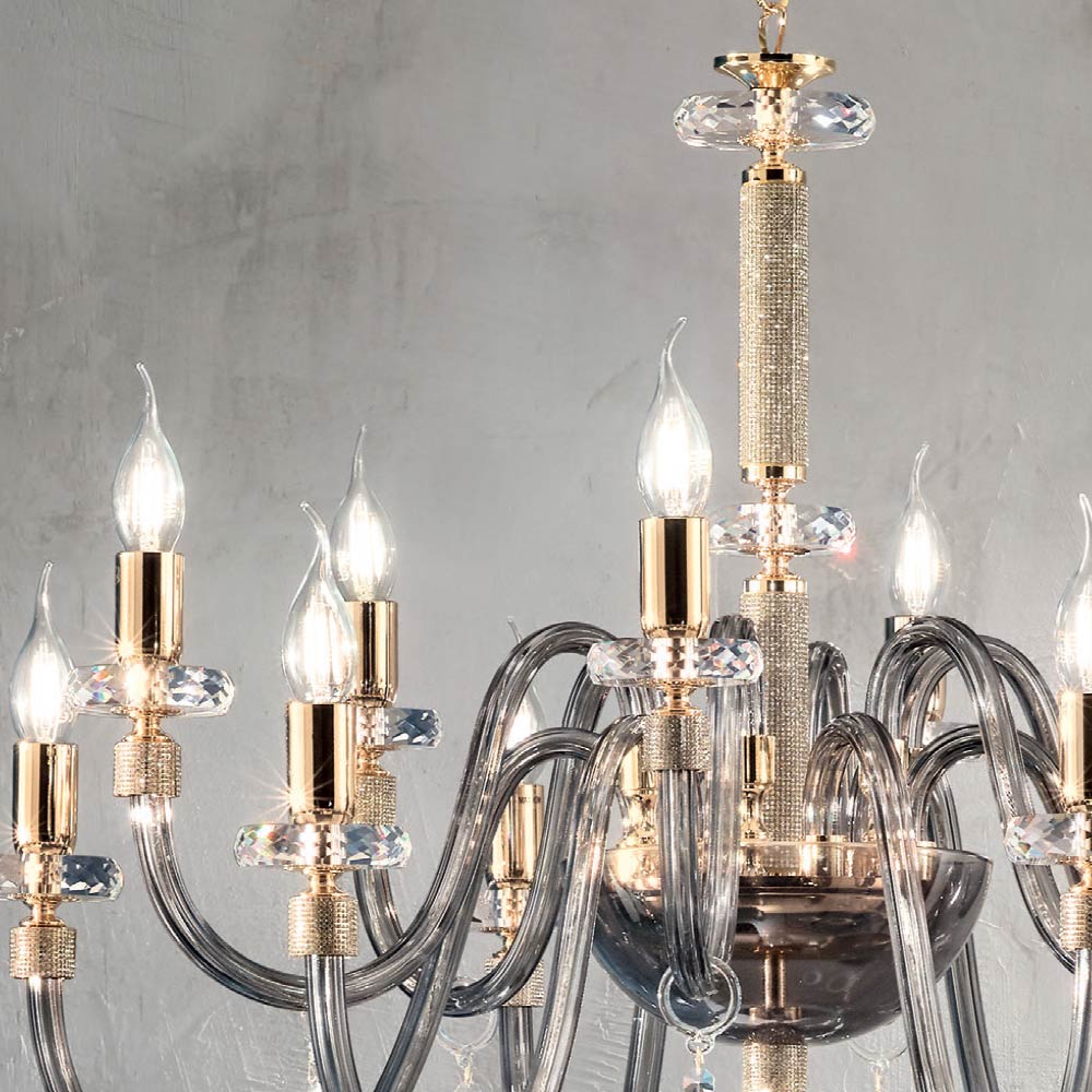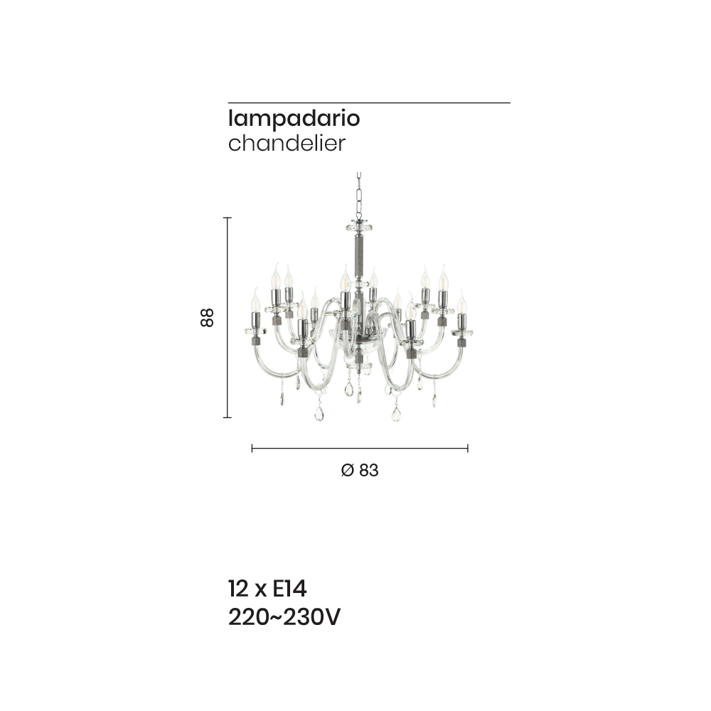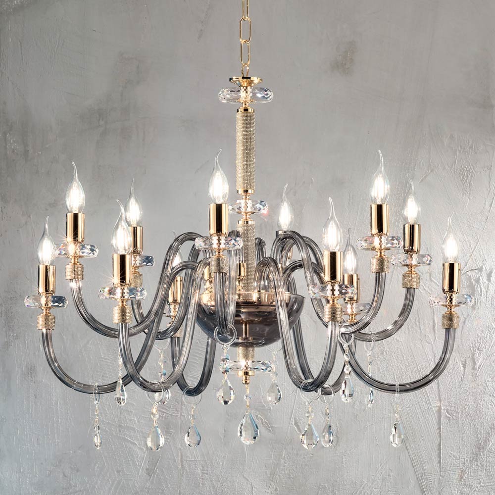 Tento závěsný lustr klasického stylu se skládá z 12 obloukových ramen vyrobených z ručně vyráběného skla v Itálii s "rigaton" efektem, jehož konec je obklopen třpytkami zasazenými do kovu, stejně jako střední část doplňku, kde dvě kruhové trubky nesou strukturu proloženou dvěma kruhovými disky různých velikostí vyrobenými z broušeného křišťálu.