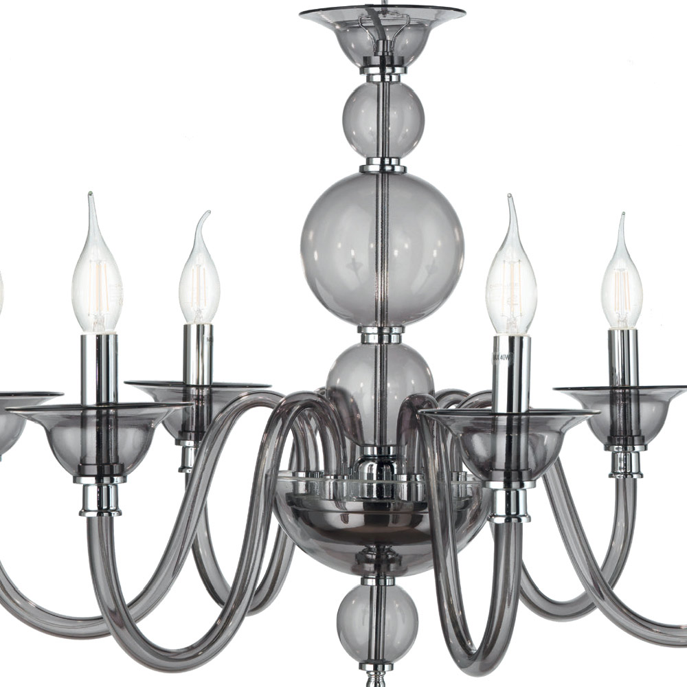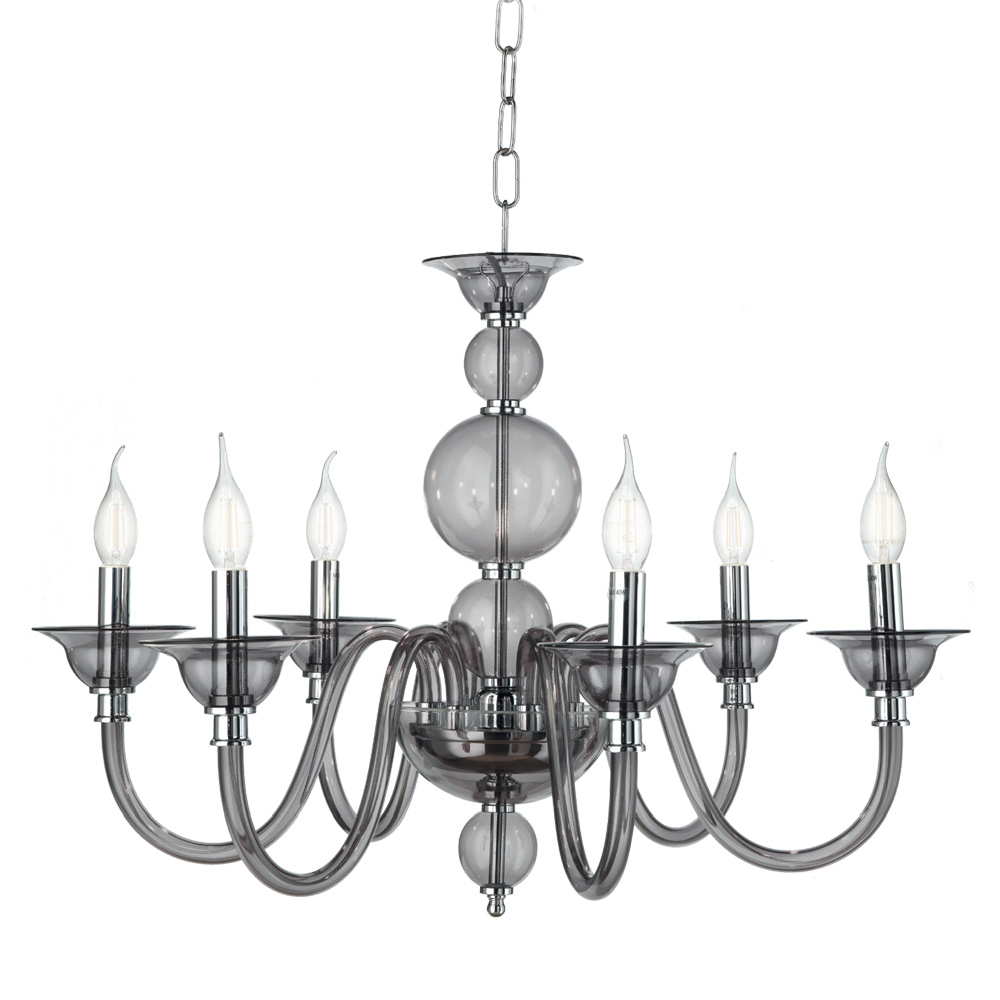 Klasický 6-ti světelný lustr z chromového kovu a ručně vyráběného kouřového skla, vyrobený v Itálii.