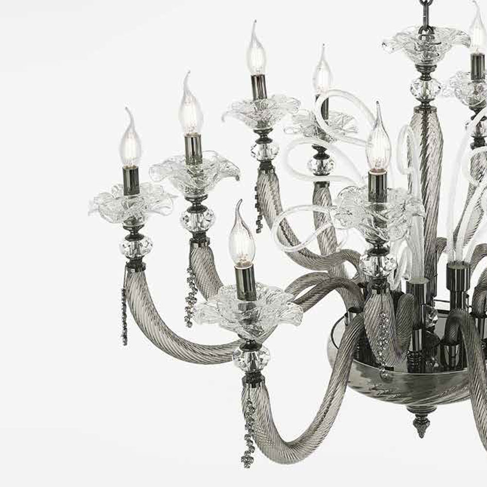 Ručně vyráběný 8 světelný lustr z foukaného skla a květinové dekorace, italský luxus.
