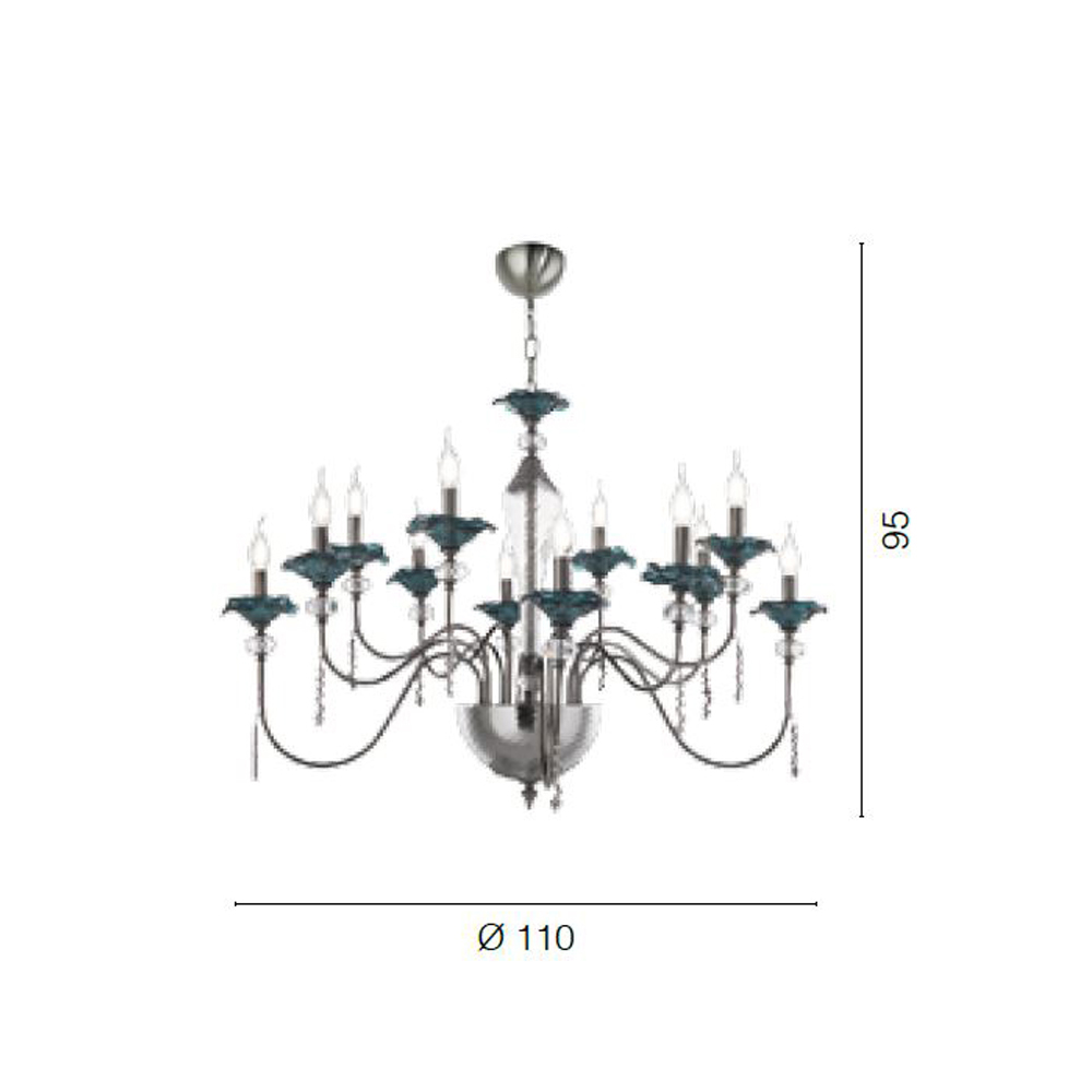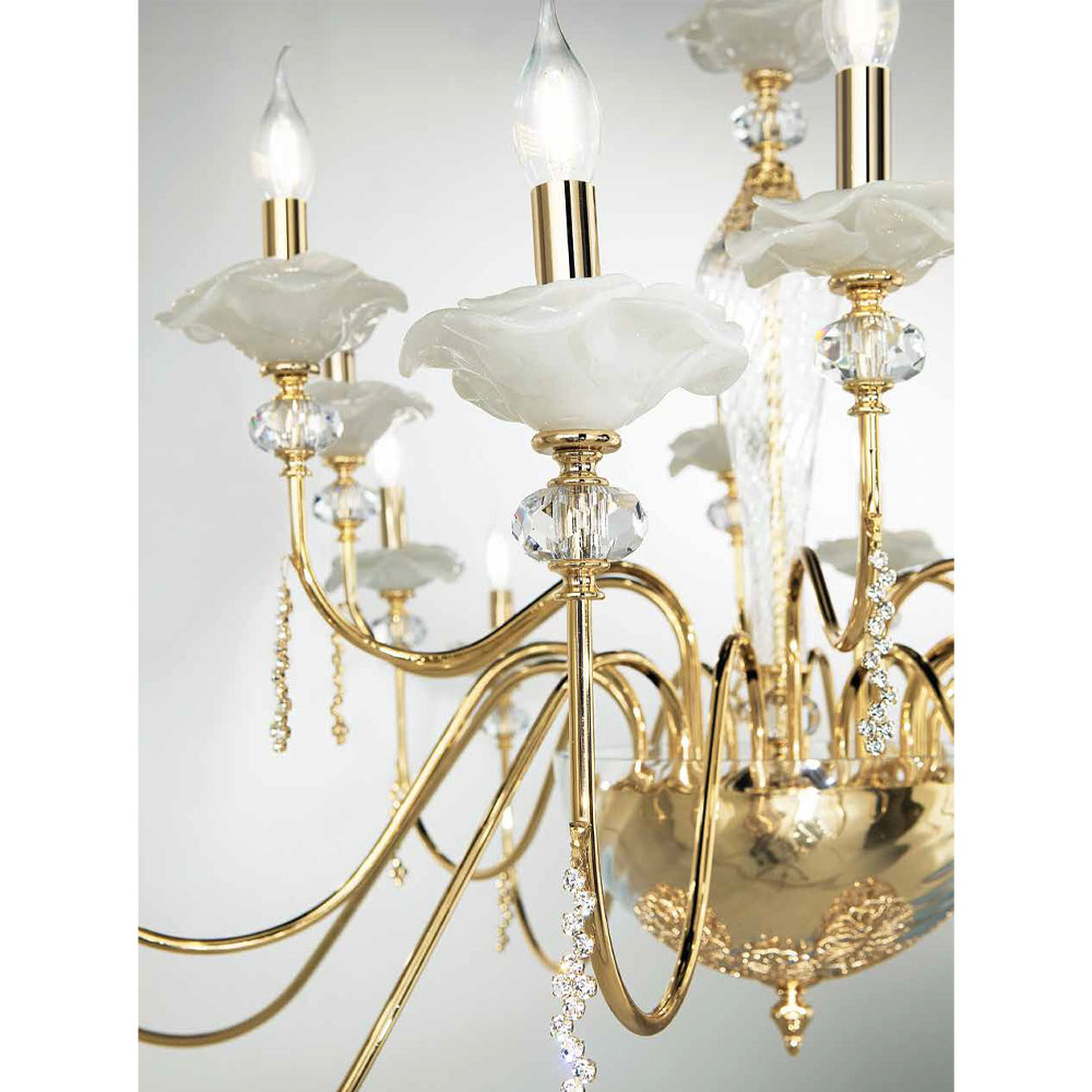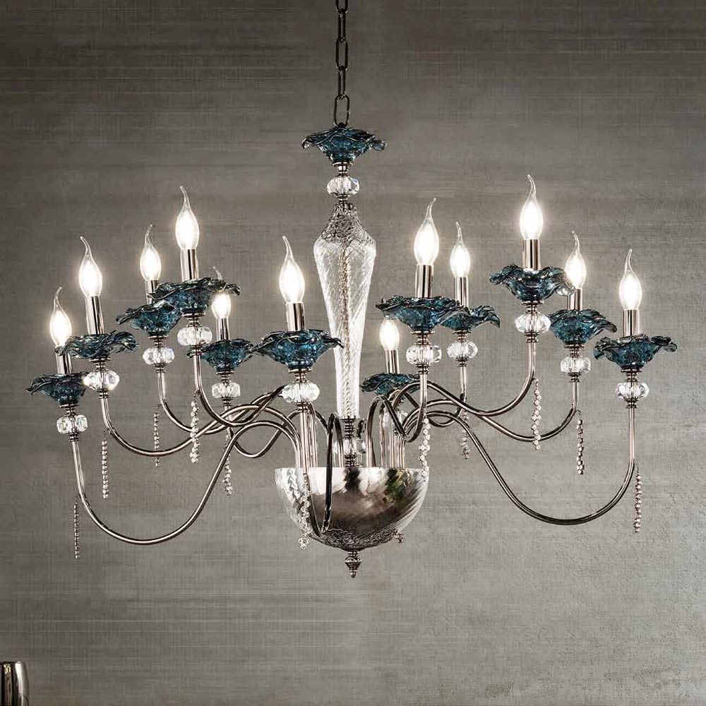 Lustr 12 světel z ručně vyráběného skla s poupaty a křišťálovými kapkami, luxus vyrobený v Itálii.
