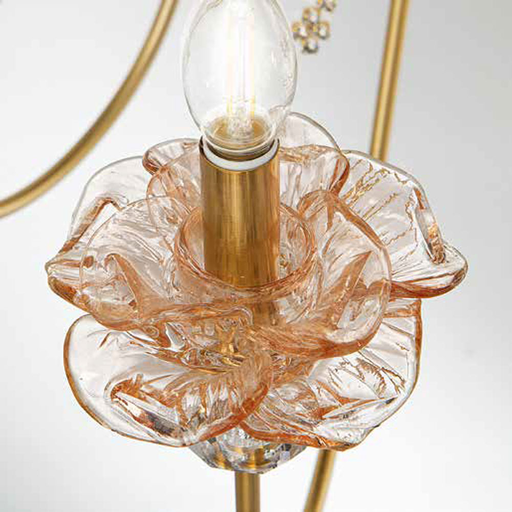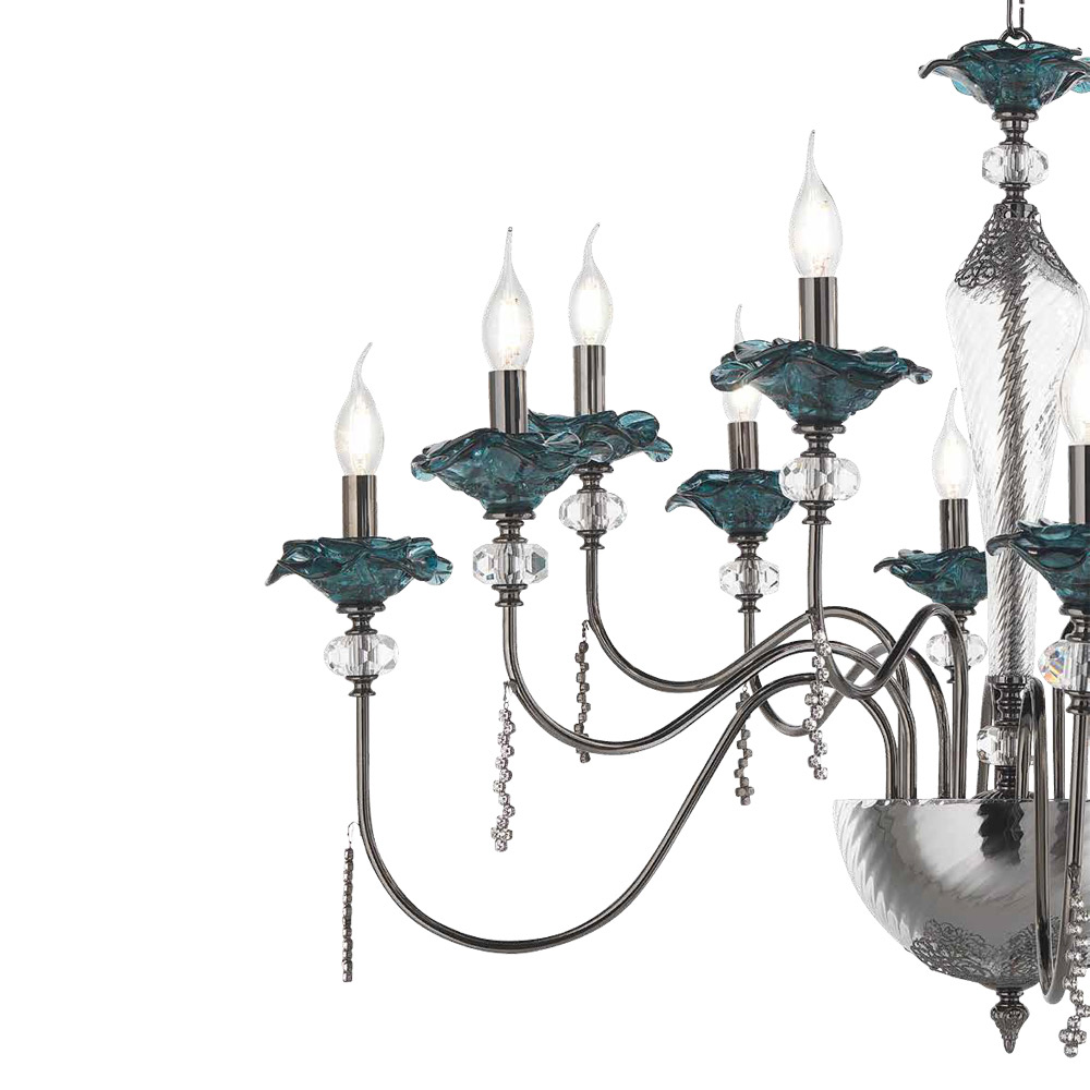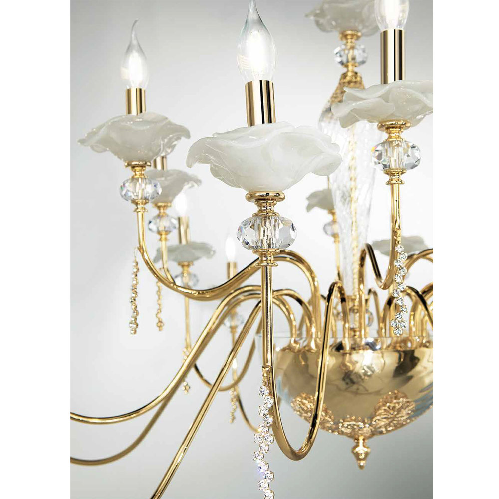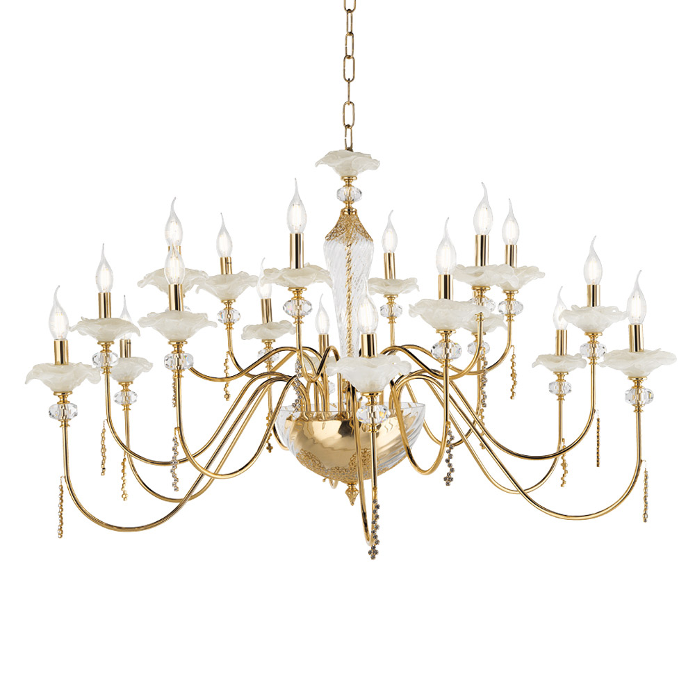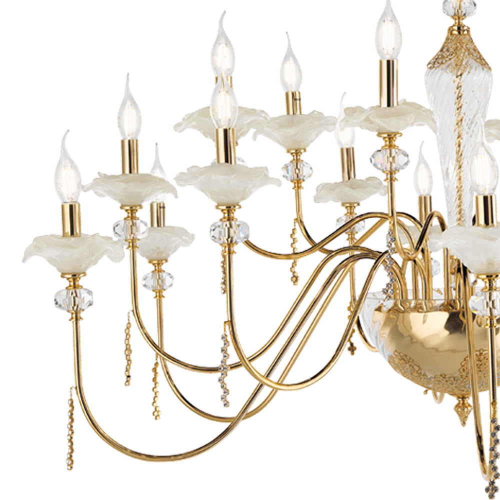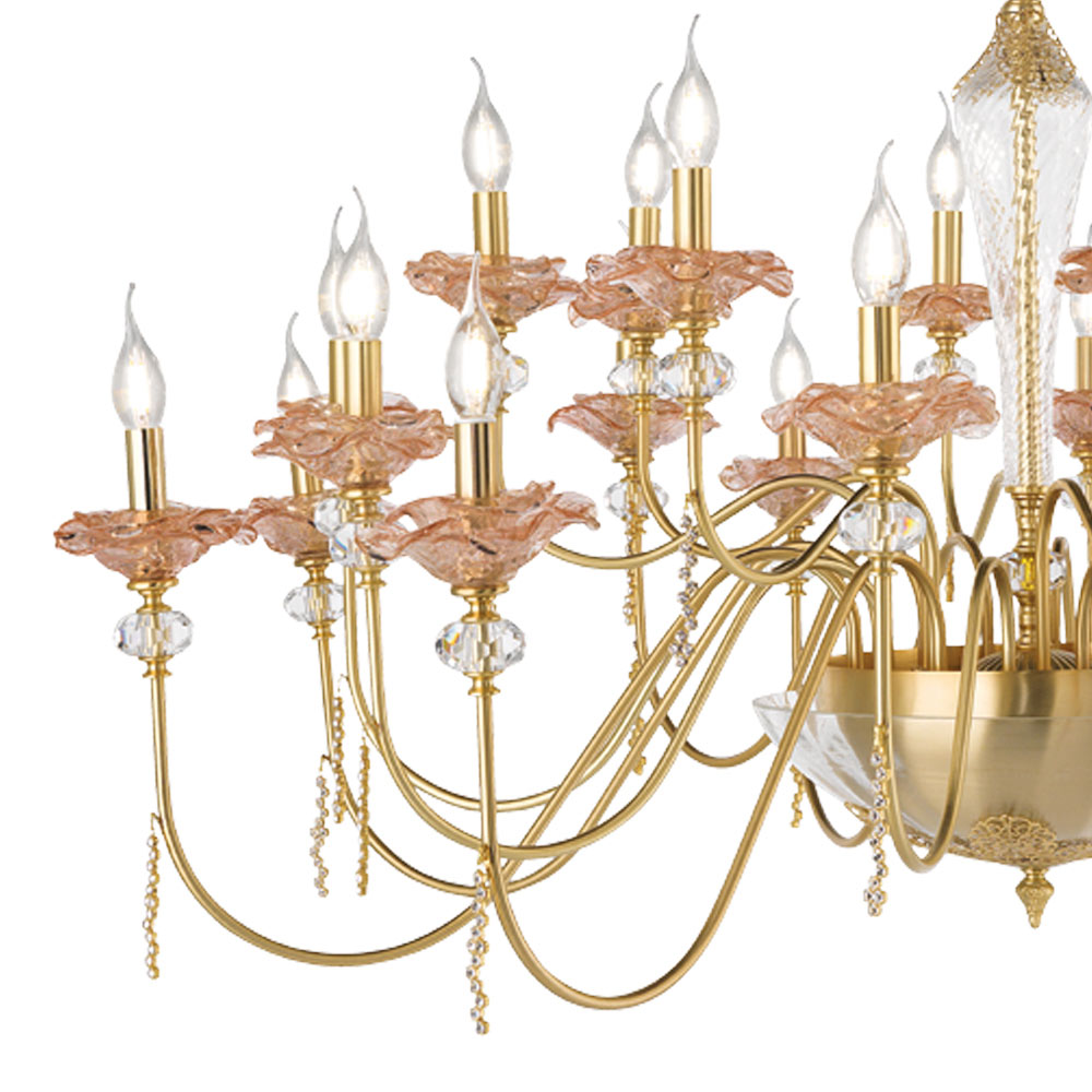 Lustr 18 světel z ručně vyráběného skla s poupaty a křišťálovými kapkami, luxus vyrobený v Itálii.