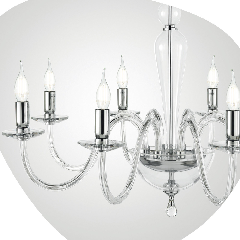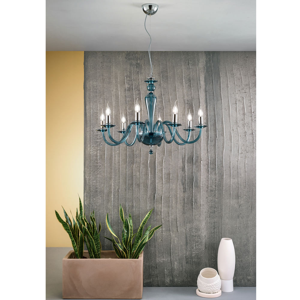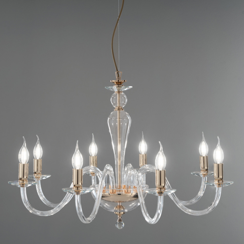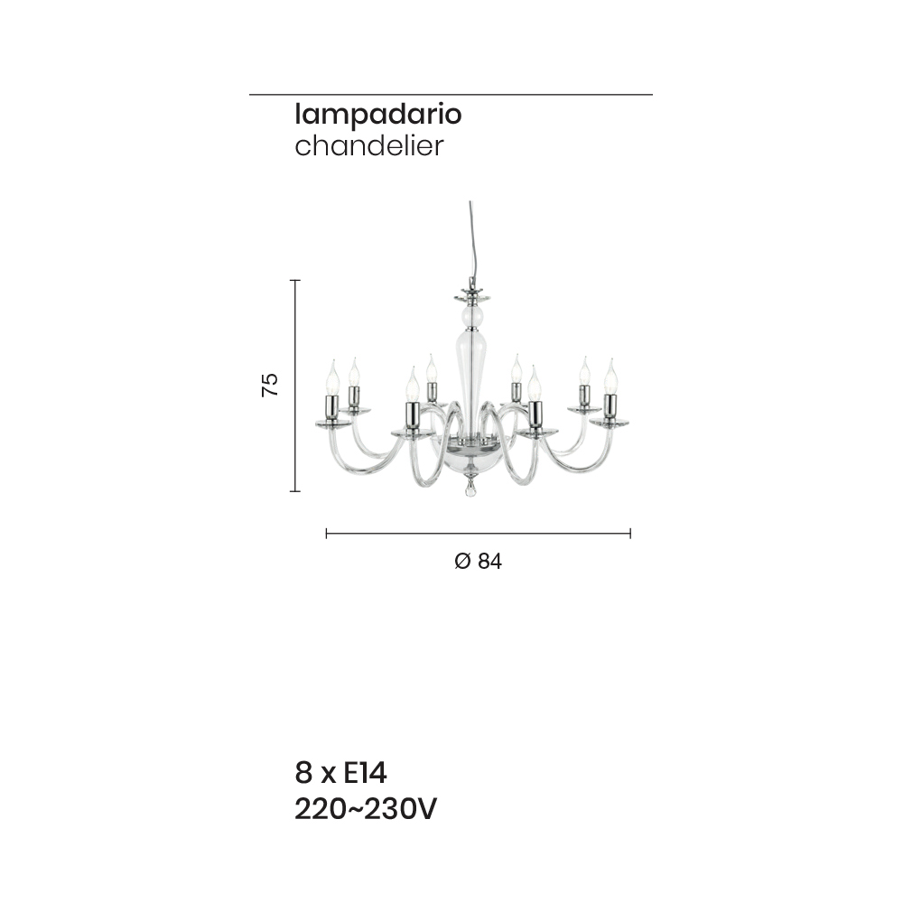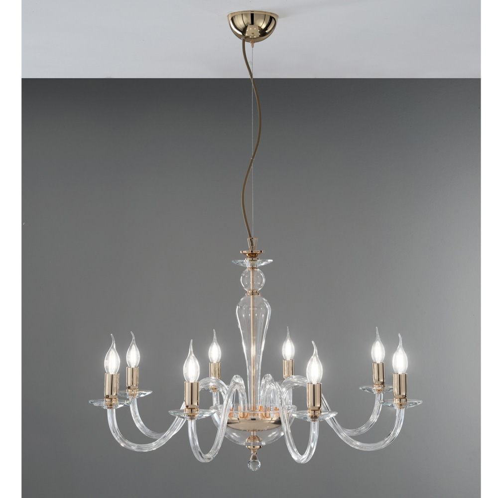 Tento závěsný lustr klasického stylu se skládá z 8 klenutých ramen vyrobených ze skla ručně vyráběného v Itálii, která podpírají talířky se zdroji světla.
