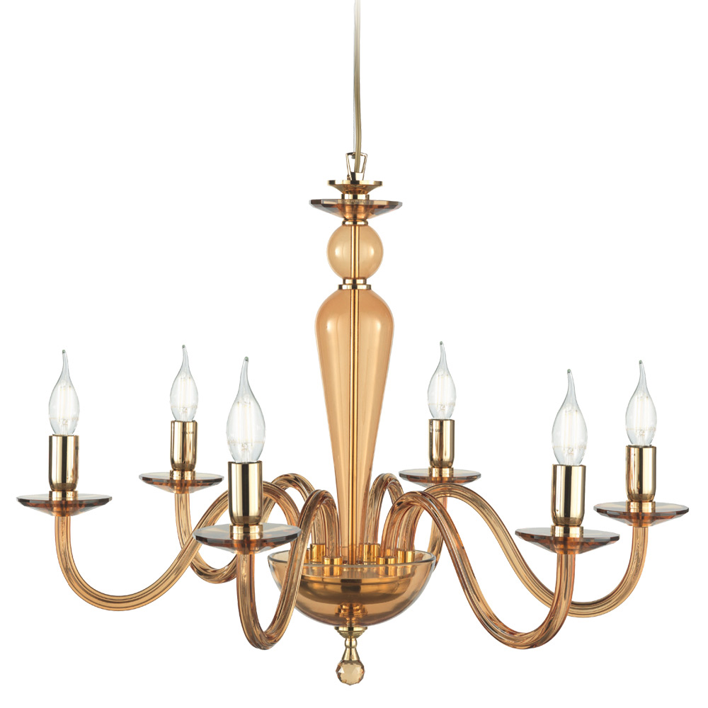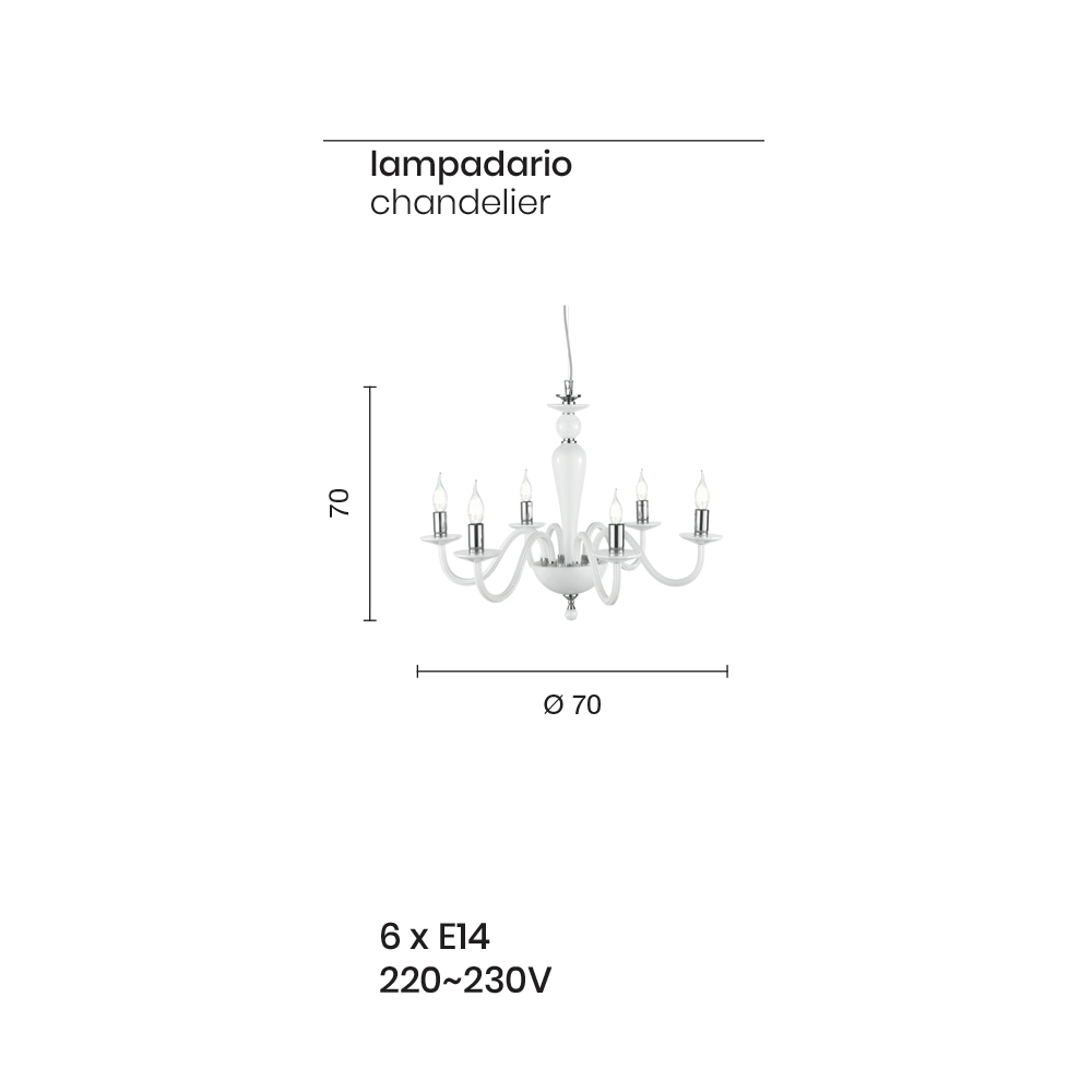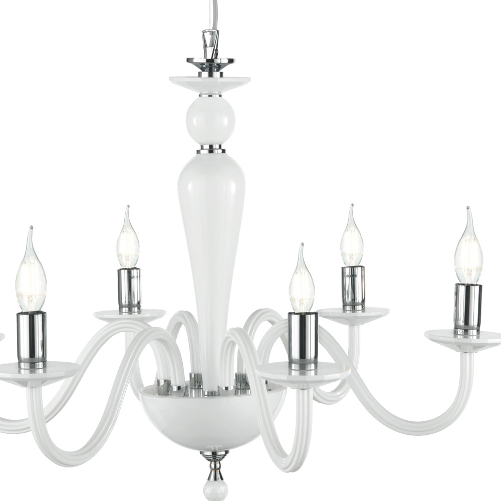 Tento závěsný lustr v klasickém stylu se skládá ze 6 obloukových ramen vyrobených ze skla ručně vyráběného v Itálii, která podpírají talířky se zdroji světla.