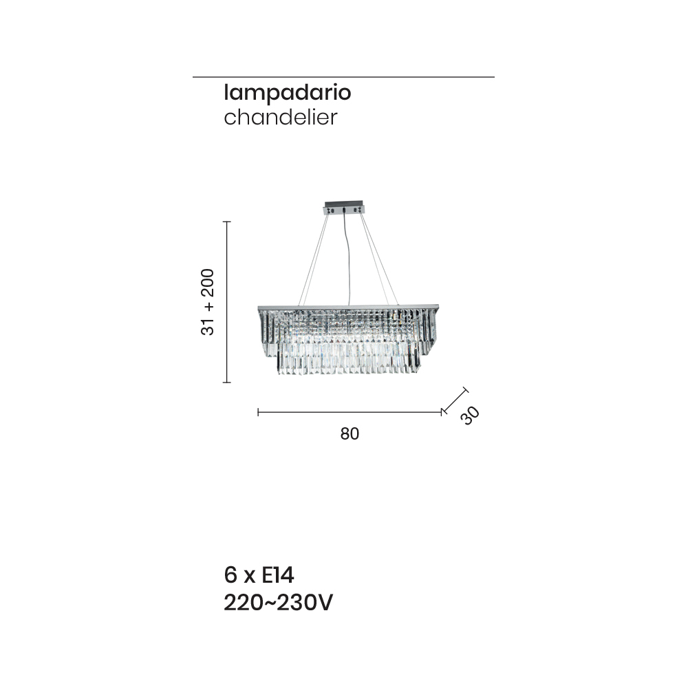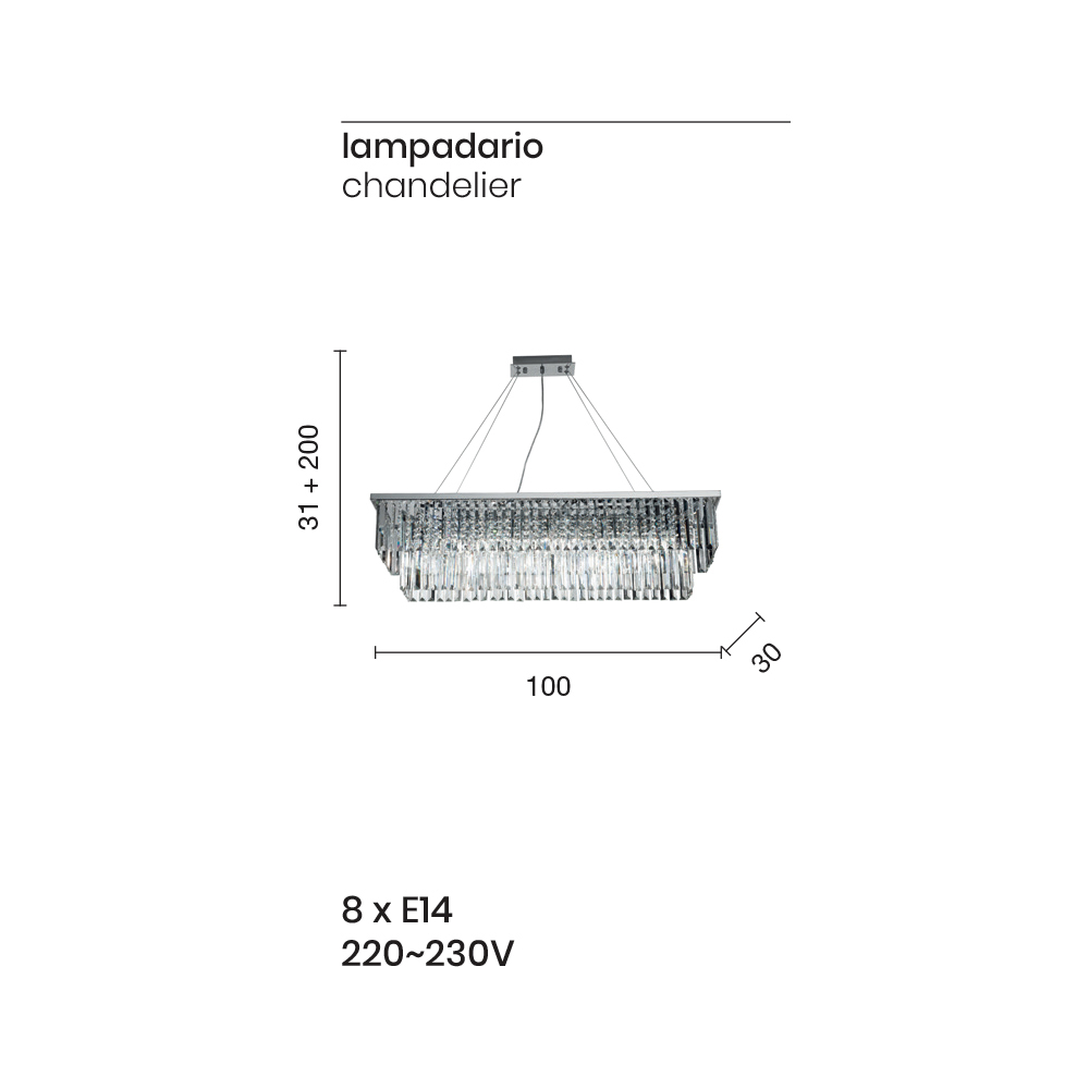 K dispozici ve dvou různých velikostech, skládá se z chromované kovové konstrukce a zavěšení s nastavitelnou délkou ocelových lanek .
