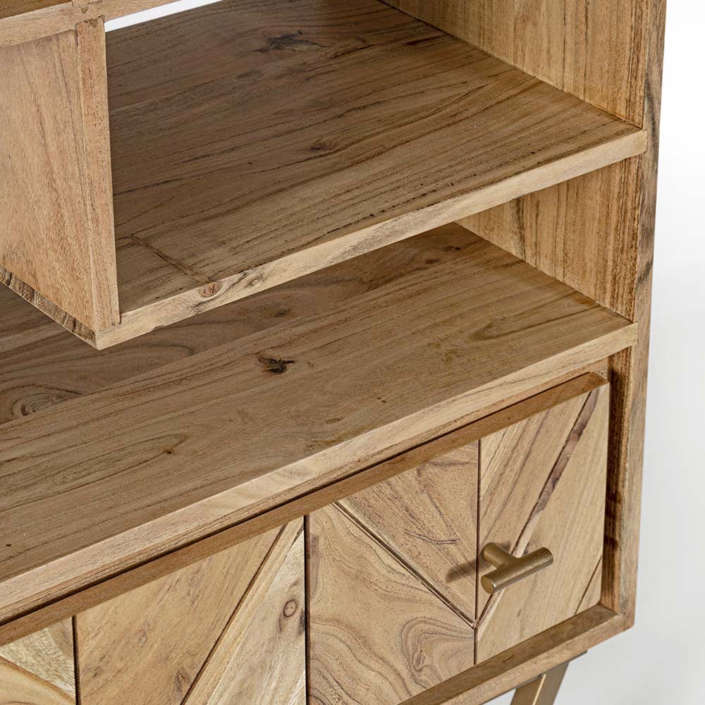Tato knihovna do obývacího pokoje má strukturu akáciového dřeva s překližkovou zadní stranou a vnitřkem zásuvek, povrchovou úpravou na bázi polyuretanového laku.