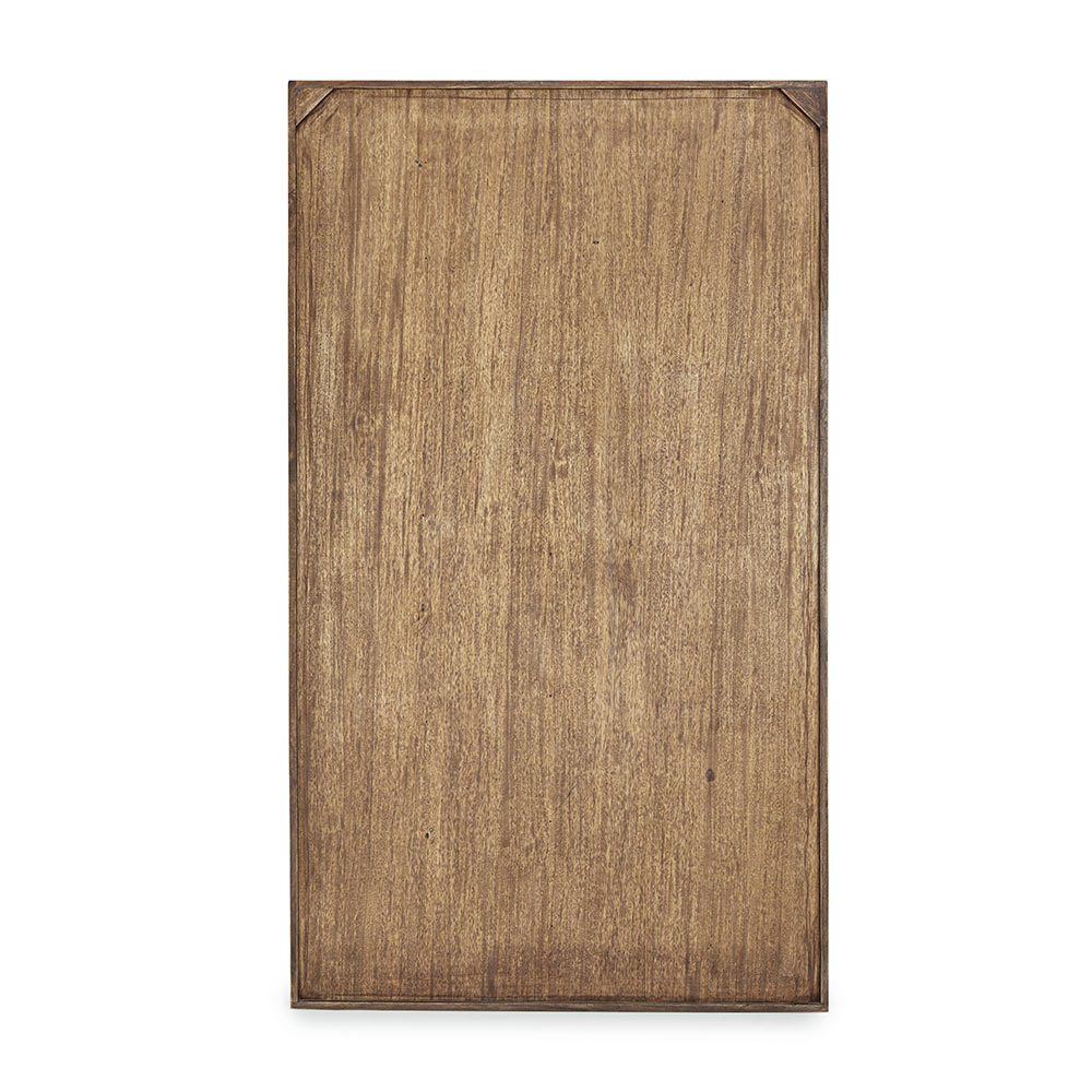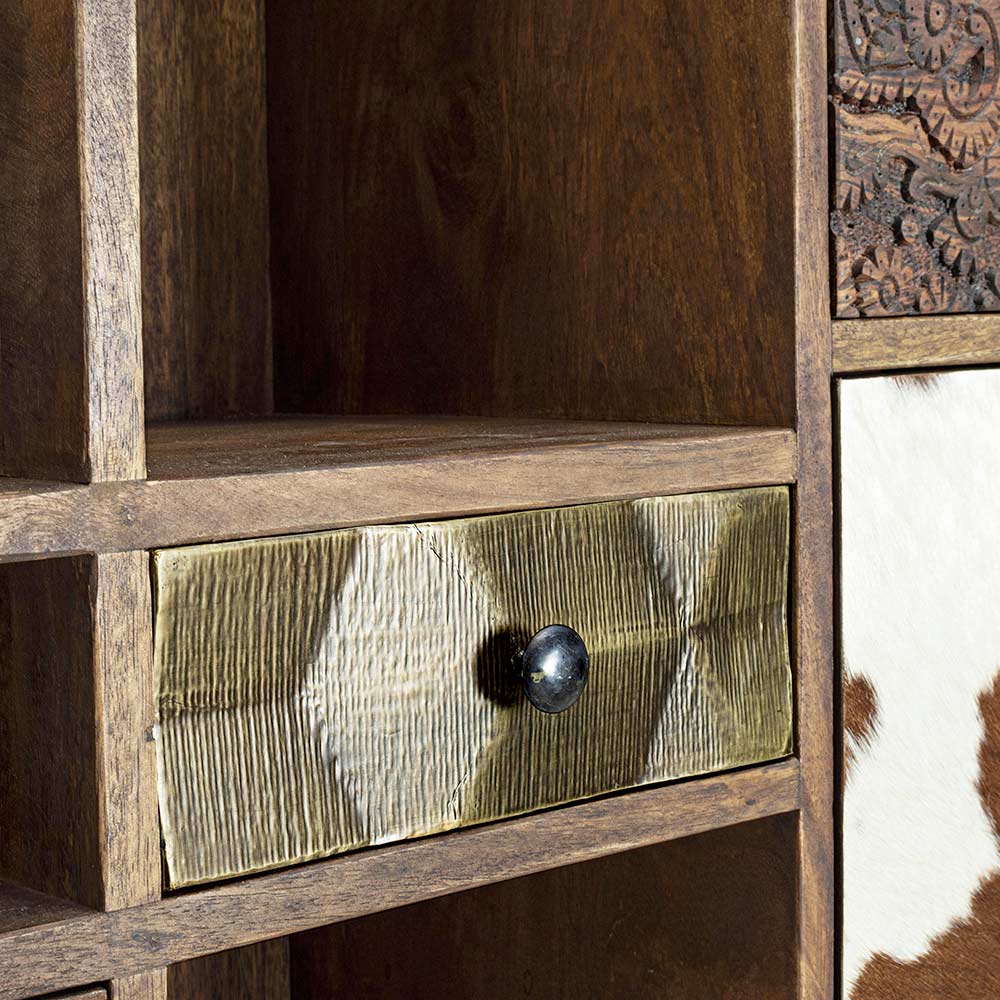 Přední část dvířek je vyrobena z recyklovaného mangového a akáciového dřeva s kovovými a koženými aplikacemi.