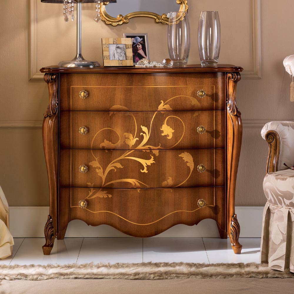 Komoda klasického stylu z ořechového dřeva Bassano se 4 praktickými a prostornými zásuvkami a elegantními vložkami. Jedinečný a vytříbený doplněk, kompletně vyrobený v Itálii zručnými mistry řemeslníky , mistry umění, kteří dotvářejí každý doplněk s moudrostí a chutí pro eleganci. Výroba je prováděna s použitím ušlechtilých materiálů a ručním prováděním práce s maximální pečlivostí a profesionalitou, která odlišuje produkty Made in Italy .