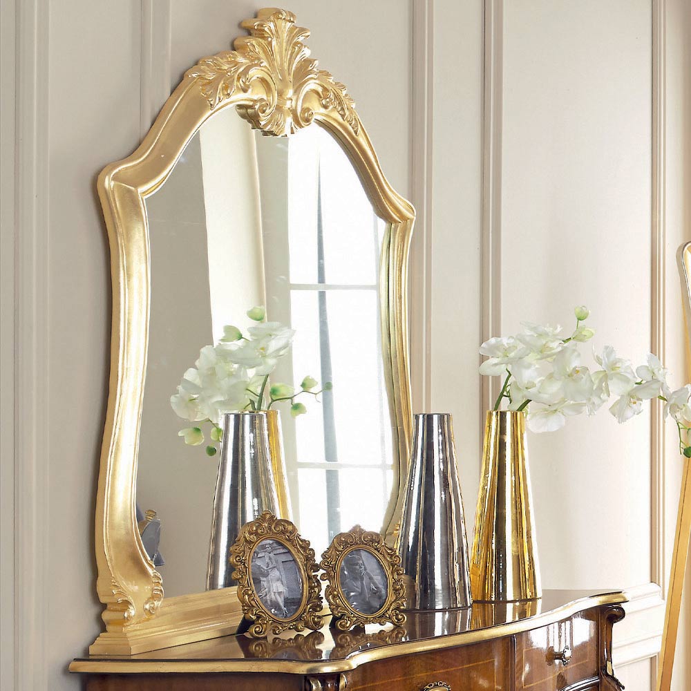 ořechu Bassano a antického zlata s elegantním vykládáním a 5 praktickými zásuvkami. Komoda je doplněna i tvarovaným zrcadlem ve dřevě potaženým plátkovým zlatem.