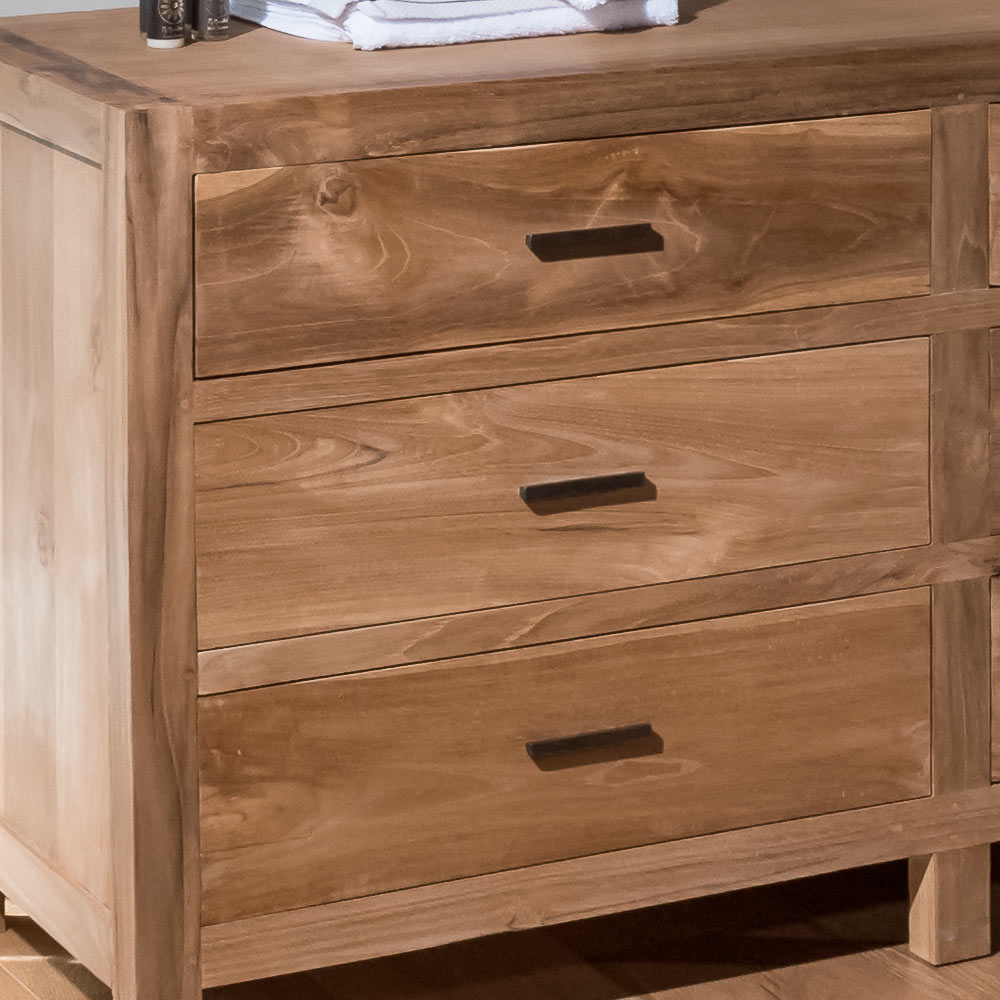 Tato masivní teaková komoda je robustní a elegantní kousek, ideální pro stylové zdobení vaší ložnice nebo obývacího pokoje. Řemeslné zpracování a přírodní dřevěná kresba jí dodávají teplý a autentický vzhled, který dokáže vylepšit jakýkoli prostor.
