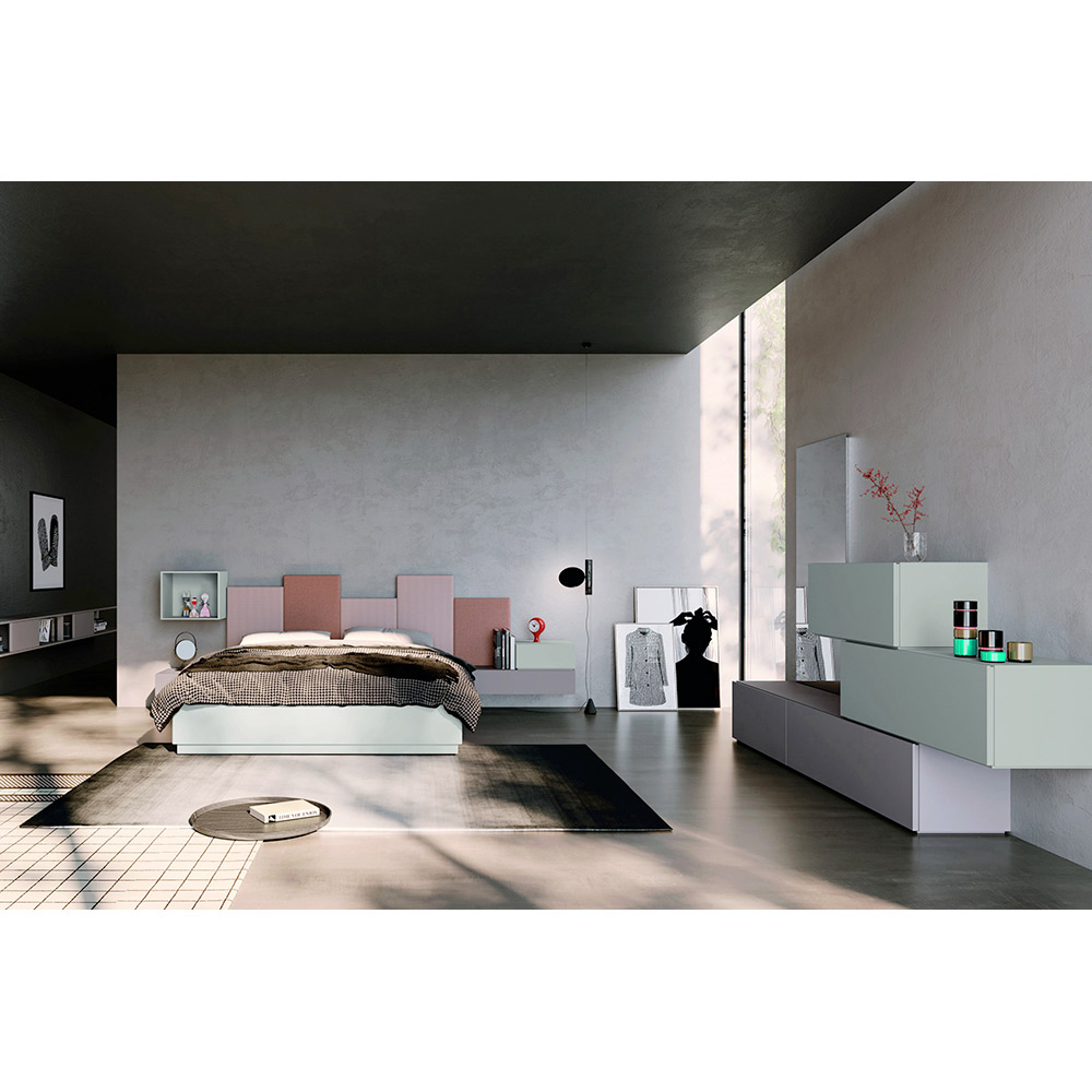manželskou postel s rámem postele z matného lakovaného dřeva s povrchem peří, dva noční stolky, z nichž jeden je modulový, komodu, rovněž modulová, a čtvercový nástěnný díl z matného lakovaného dřeva s pérem a povrchová úprava hortenzie. Nápad na zařízení, který nabízí nekonečné možnosti pro snění díky