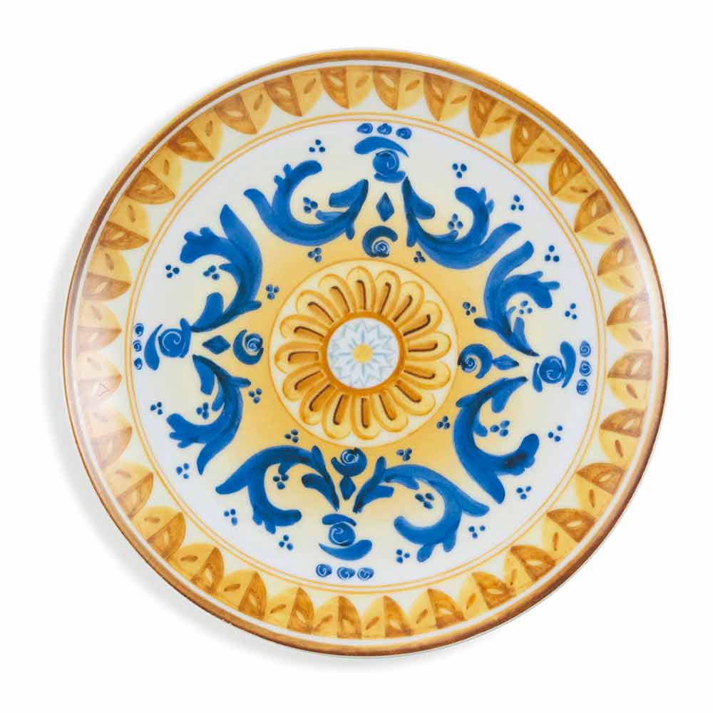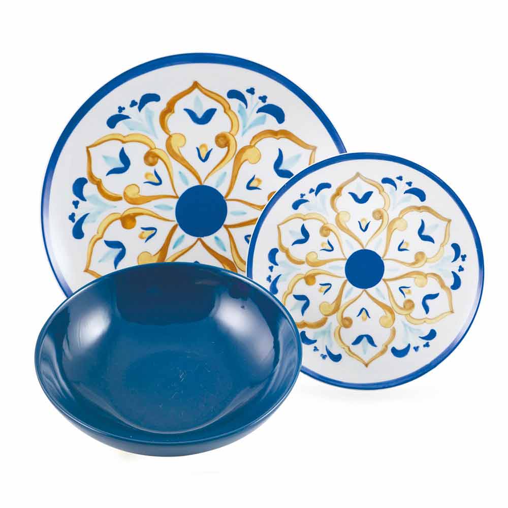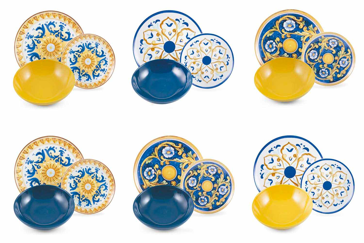 Stolový servis z porcelánu a kameniny v modré a žluté barvě, moderní design 18 kusů.