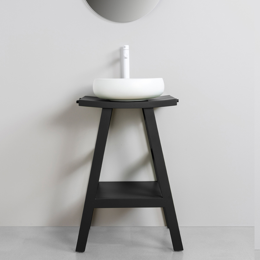 Koupelnová kompozice s podlahovou skříňkou v přírodním černém teaku a doplňky.