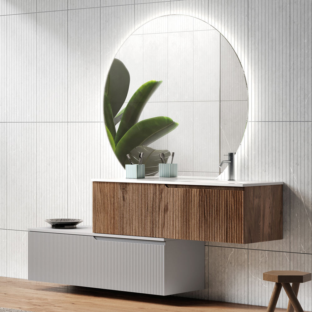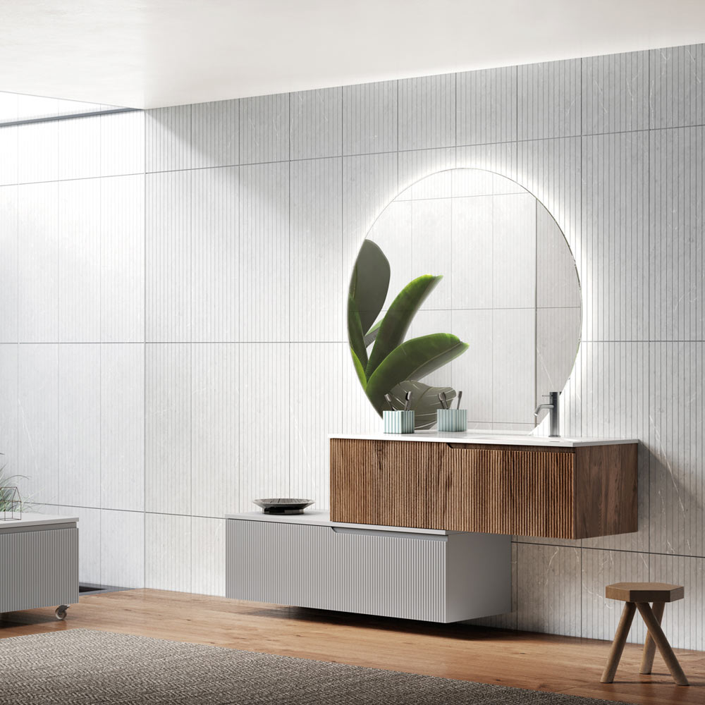 Kompozice koupelny v šedé MDF a žebrovaném dubu Rio Made in Italy
