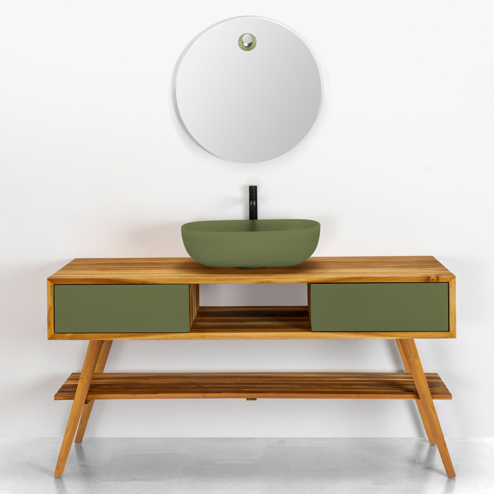 přírodního recyklovaného teaku, doplněná 2 praktickými zásuvkami v zeleném lakovaném