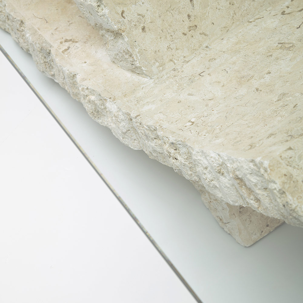 Konferenční stolek má originální a inovativní design. Vyrobeno s bílou povrchovou strukturou z fosilního kamene a 10 mm leštěnou skleněnou deskou.