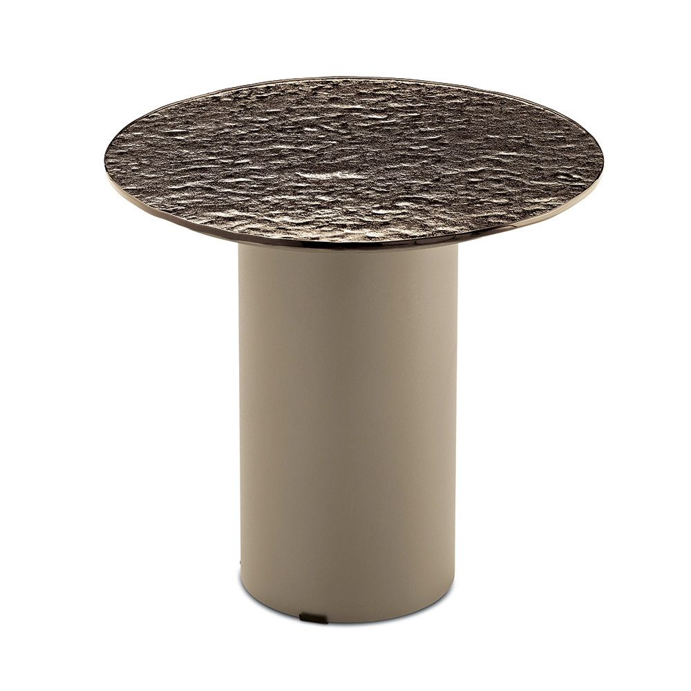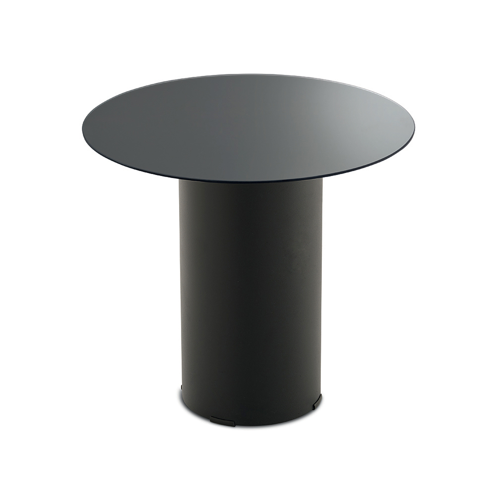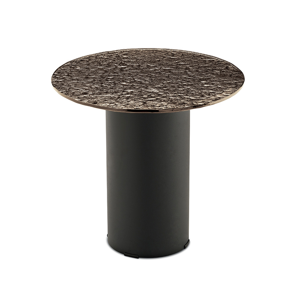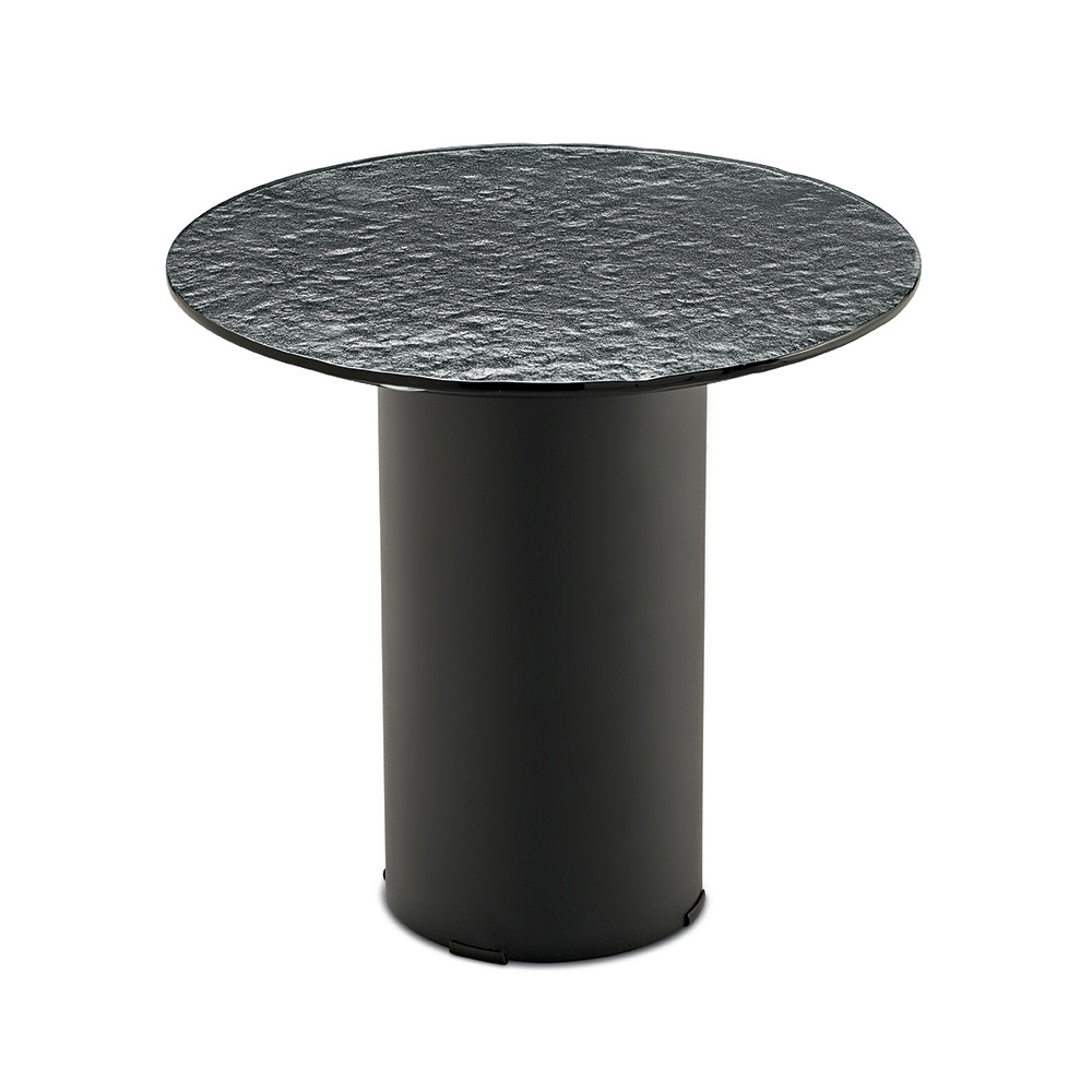 Konstrukce se vyznačuje válcovou lakovanou kovovou základnou , pevnou, ale zároveň vizuálně lehkou, která vyvažuje horní část. Tento kontrast mezi plnými objemy a tenkými povrchy vytváří moderní a elegantní estetiku, ideální pro sofistikované prostory.