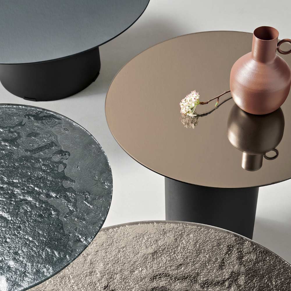Vrchní deska je k dispozici v provedení z tepaného skla se stříbrným zadním povrchem nebo v hladkém zrcadle , obě řešení jsou navržena tak, aby odrážela světlo a vylepšila prostor výraznými vizuálními efekty. Možnost kombinování povrchových úprav a barev vám umožňuje přizpůsobit si stůl vašemu stylu.