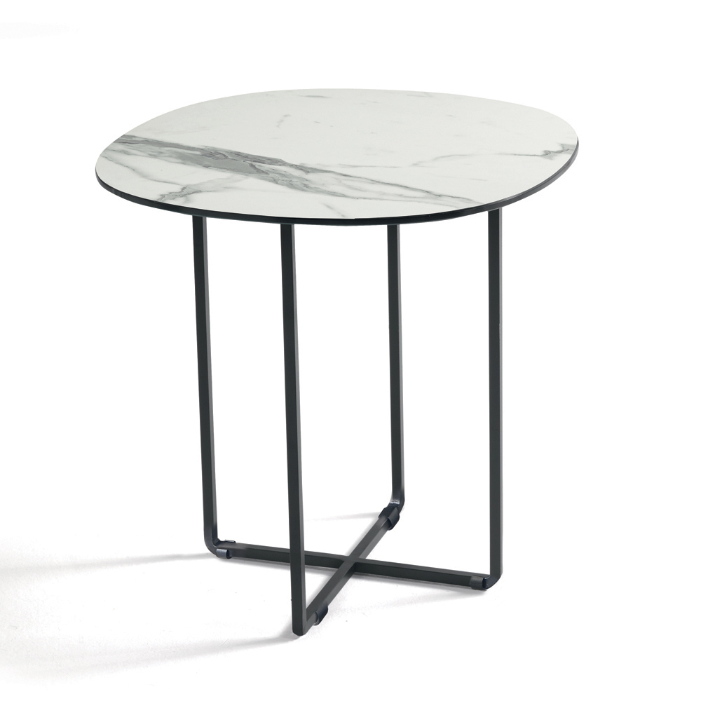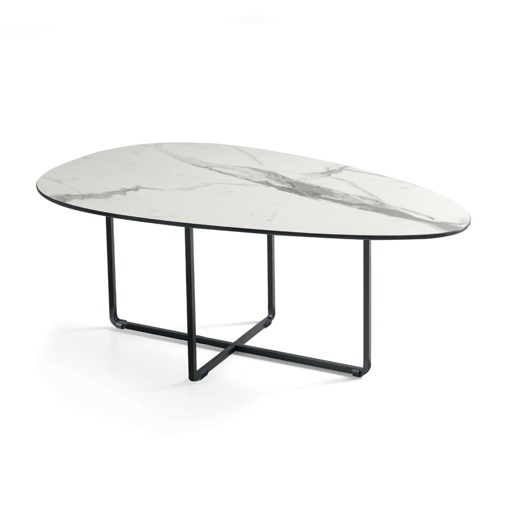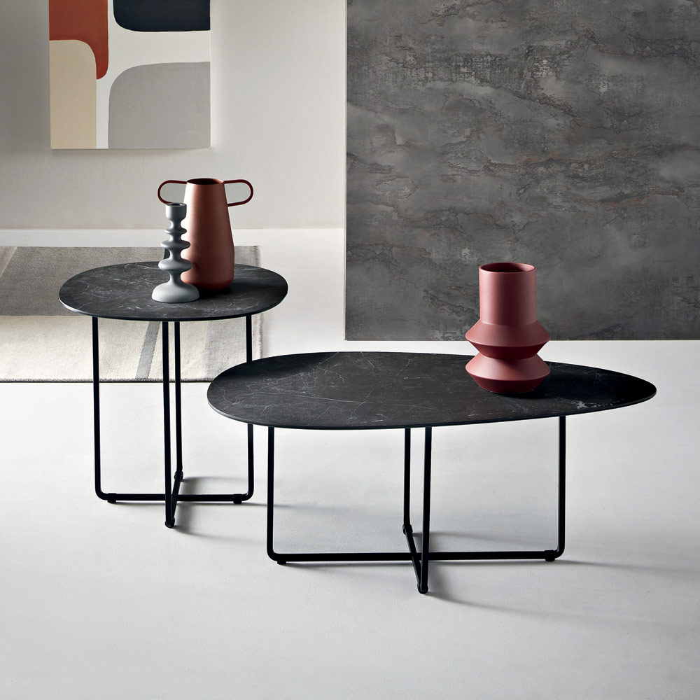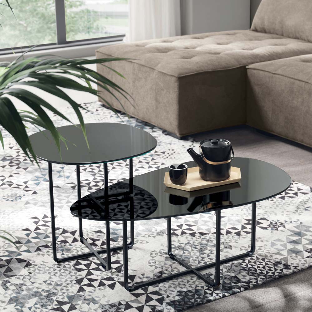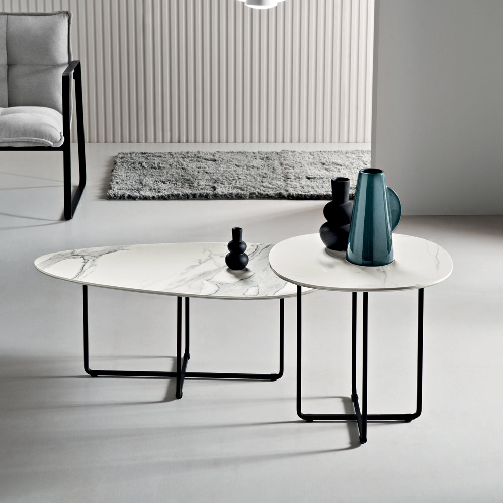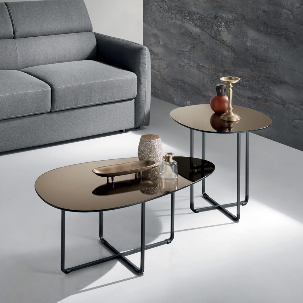 Vrchní deska je k dispozici v provedení zrcadlového skla , které zesiluje jas prostoru, nebo v keramickém provedení s mramorovým efektem naneseném na sklo , což je řešení, které kombinuje odolnost a estetickou propracovanost. Tato dvojí možnost vám umožňuje přizpůsobit stůl stylu místnosti.