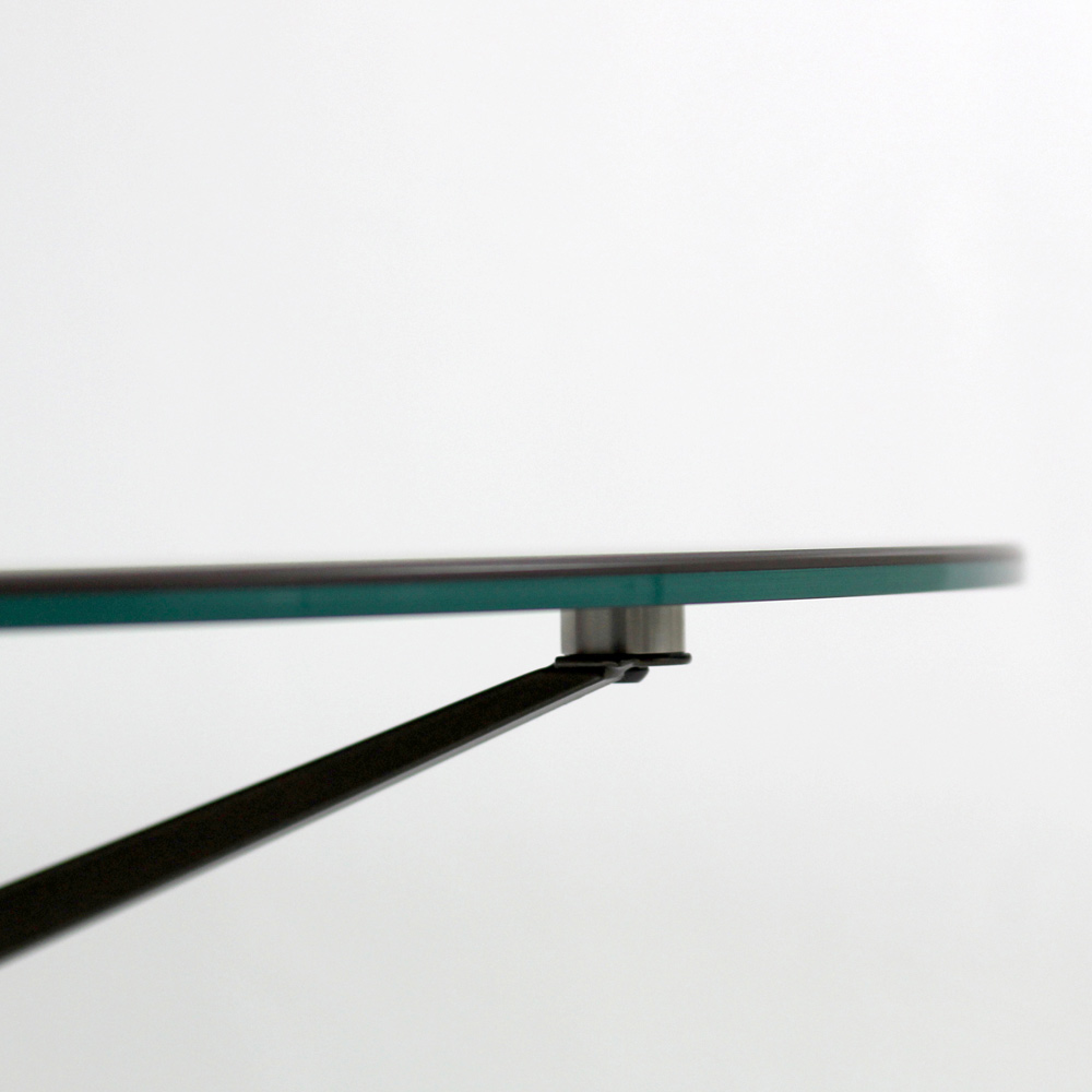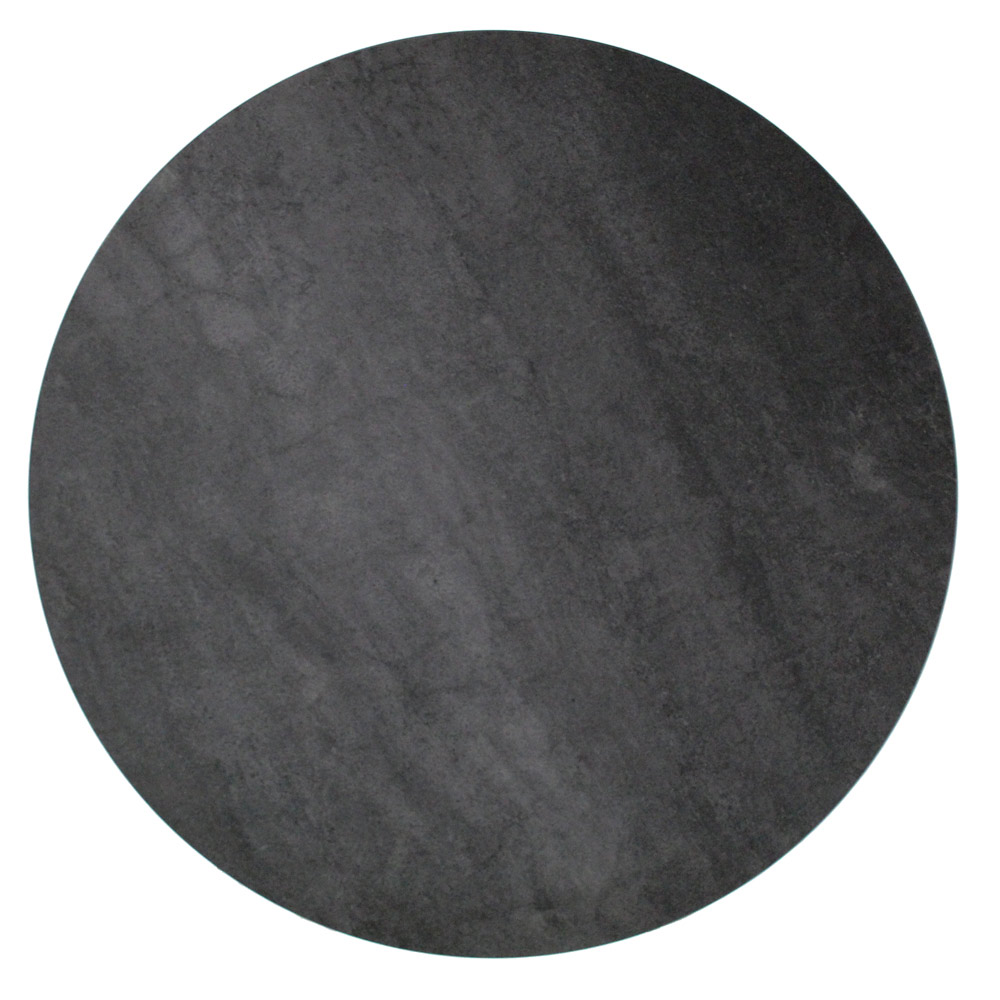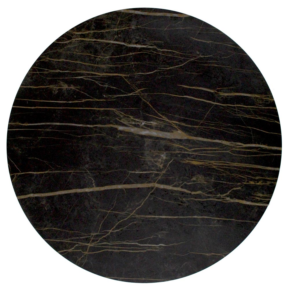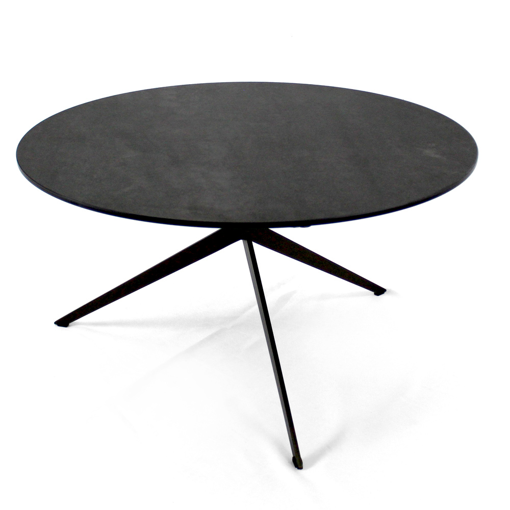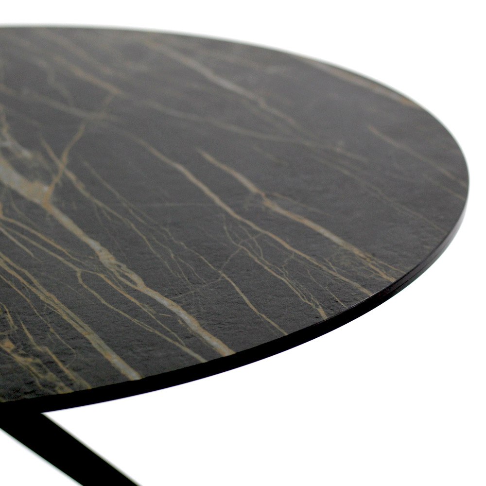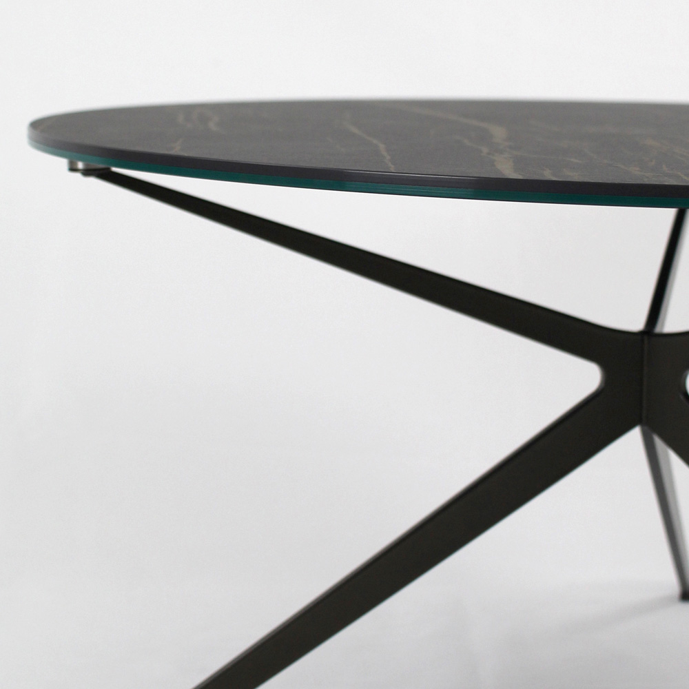 Kulatý konferenční stolek s lakovanou ocelovou základnou a horní deska z porcelánové kameniny.